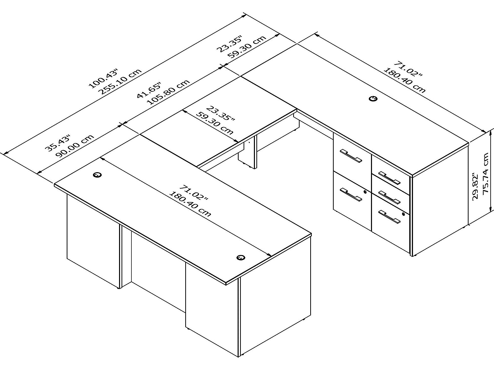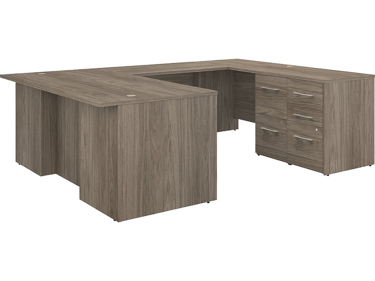 The Bush Business Furniture Office 500 71"W U-shaped executive desk with drawers provides a modern workspace with professional style and quality. Highlighted by its distinctive breakfront design, this desk presents a workspace that showcases the style and personality of today's professional. Take a prominent position in your private office as you spread out on a spacious wraparound desktop with built-in wire management. A three-drawer and two-drawer file cabinets fit underneath the U-shaped desk for easy access to materials. File drawers accept legal-, letter-, and A4-size paperwork while two box drawers organize writing utensils, notepads, and other supplies. All three file drawers and one box drawer can be locked to secure sensitive documents and personal items. This U-shaped desk with storage is tested to meet ANSI/BIFMA quality standards for safety and performance and is backed by a 10-year manufacturer's warranty. American-made with US and imported parts.