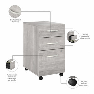 The Bush Business Furniture Studio A three-drawer mobile file cabinet combines a fresh contemporary appearance with the commercial-quality construction needed to withstand years of everyday use. The file drawer opens on smooth full-extension ball bearing slides for an effortless reach to letter-, legal-, and A4-size paperwork, while two box drawers organize writing utensils, notepads, and more. The two bottom drawers can be secured by a single lock to protect sensitive files and personal items. The rolling file cabinet's compact design allows it to fit underneath a standard-size office desk for a space-saving configuration. This three-drawer file cabinet with wheels has been meticulously tested to meet or exceed the ANSI/BIFMA standards for safety, durability, and performance and is backed by the Bush Business Furniture 10-year manufacturer limited warranty. American-made with US and imported parts.