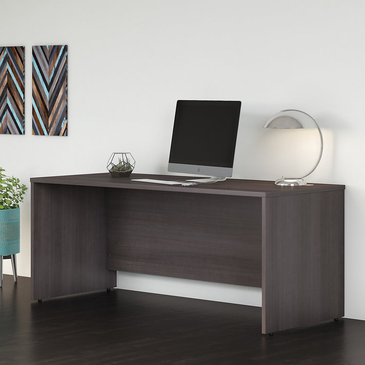 Choose the Bush Business Furniture Studio C 72W Office Desk for a durable design that works hard for years with a fresh finish that looks great anywhere. With a thick surface, an extended modesty panel and clean lines, the Office Desk conveys a classic look but adds a contemporary White or Storm Gray finish to meet the style needs of the modern workspace. The thermally fused laminate finish, durable edge banding and sturdy end panels resist scratches, stains or dents while standing up to the rigors of a 40-plus hour work week. Keep pesky computer cords out of your way with the cable management system for an organized work surface. Combine the Desk with matching products and accessories from the Studio C collection to create a unique office for the way you work. This contemporary office furniture comes with a 10 Year Warranty and meets ANSI/BIFMA quality test standards. See the full collection for coordinating items available to make your office your own with Studio C. American made with U.S. and imported parts.