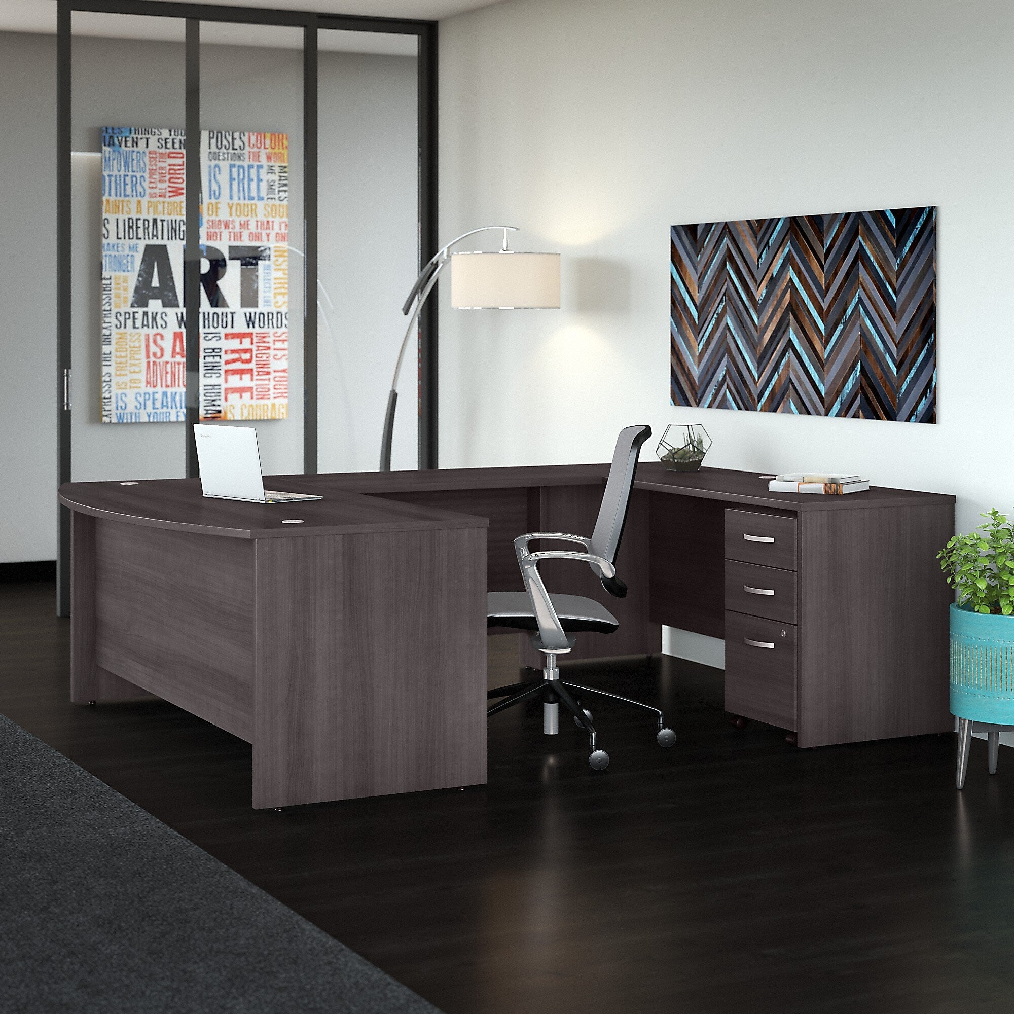 Give your office the workspace you need and the style you deserve with this Bush Business Furniture Studio C U Shaped Desk with Mobile File Cabinet. The extended surface of the 72W x 36D Bow Front Desk offers guests a rounded front to pull up a chair and collaborate, while the expansive U shaped configuration has all the room you could ever want to spread out and multitask. With a thermally fused laminate finish, this office set stands up to years of everyday use. Keep pesky computer cords out of your way with a cable management system for a neat work surface. The 3 Drawer Mobile File Cabinet rolls with you throughout your office or remains in place as needed on any surface. The popular, classic office furniture design receives a contemporary update with trendy White and Storm Gray finish options to fit seamlessly in a private office or as part of a larger environment. This office set comes with a 10 Year Warranty and meets ANSI/BIFMA quality test standards for performance and safety. American made with U.S. and imported parts.