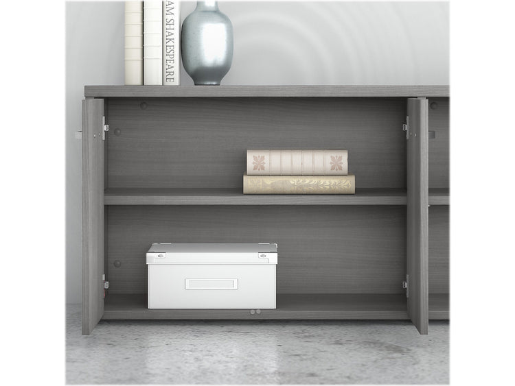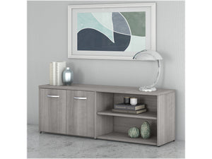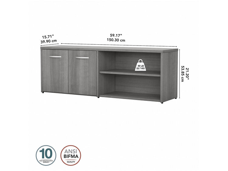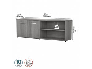 The Bush Business Furniture Studio C low storage cabinet with doors and shelves offers a stylish, long-lasting workplace organization solution for today's professionals. Its open and closed compartments each include one fixed shelf and one adjustable shelf to accommodate everything from books and reference materials to decorations. Each shelf supports up to 50 lbs., so storing and displaying larger items is never an issue. The surface of the storage cabinet can be used as a practical place to keep a small printer and other equipment or to give your workspace a personal touch with pictures, plants, and more. This office storage cabinet has been meticulously tested to meet or exceed ANSI/BIFMA quality standards for safety, durability, and performance and is backed by the Bush Business Furniture 10-year manufacturer warranty. American-made with US and imported parts.