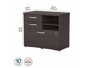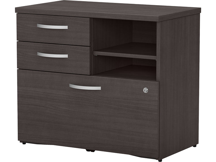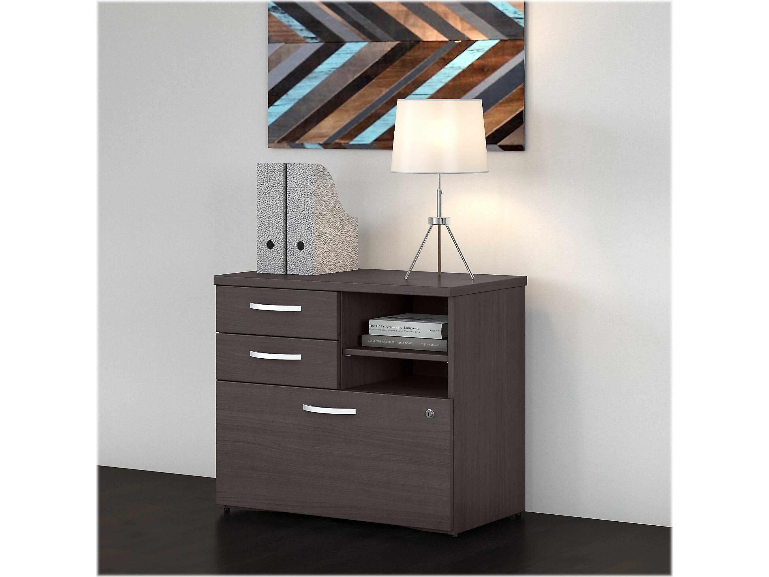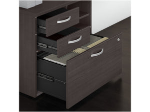 The Bush Business Furniture Studio C office storage cabinet with drawers and shelves offers a stylish, long-lasting workplace organization solution for today's professionals. Keep important documents, office supplies, work in progress, and equipment in order so you can access the materials you need quickly and easily. A file drawer opens on smooth full-extension ball bearing slides for an effortless reach to letter-, legal-, and A4-size paperwork and can be locked to protect sensitive information. Two box drawers organize writing utensils, notepads, and other supplies, while the open shelves are perfect for frequently used items. This lateral file cabinet with shelves has been meticulously tested to meet or exceed ANSI/BIFMA standards for safety, durability, and performance and is backed by the Bush Business Furniture 10-year manufacturer's warranty. American-made with US and imported parts.