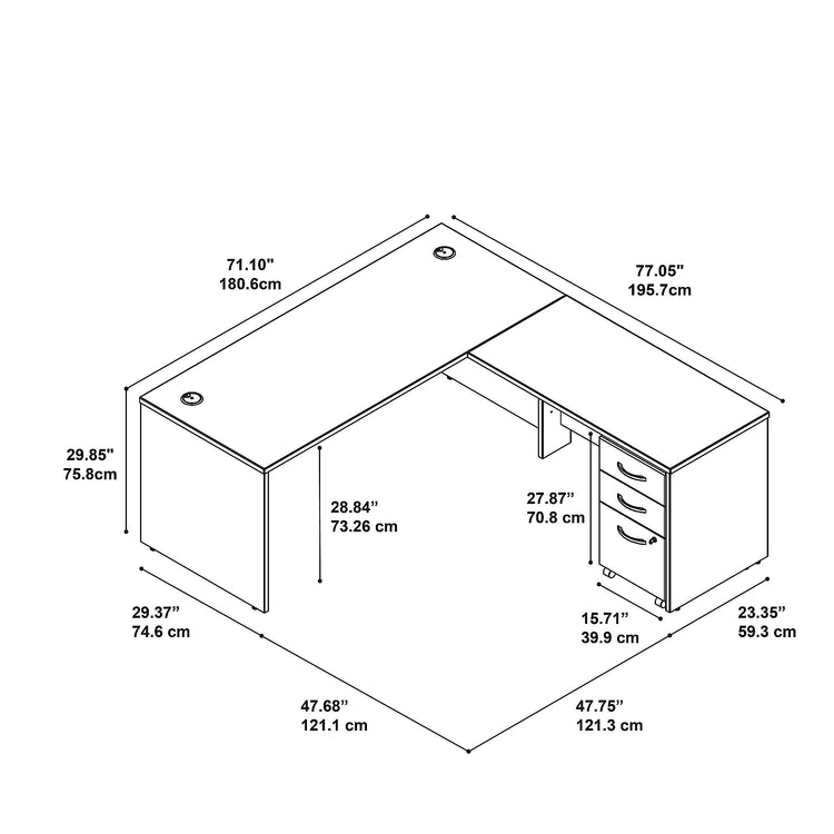 Functionality meets style with this Bush Business Furniture Westfield L Shaped Desk. Make a professional statement with the clean lines, Brushed Nickel hardware and extended modesty panels of Westfield. Depend on the durable thermally fused laminate finish, sturdy construction and rugged edge banding for long-lasting commercial quality. Spread out with your computer, phone, paperwork and more on the roomy 72W and 48W work surfaces, and feed your cables through wire management grommets to keep them under control. Take care of your filing and storage needs with the convenient Mobile File Cabinet, which fits underneath the Desk or rolls anywhere. Westfield offers endless layout options, expansion opportunities and 7 finishes. This affordable office furniture withstands the rigors of a 40-plus hour work week and comes with a 10 Year Warranty. American made with U.S. and imported parts.