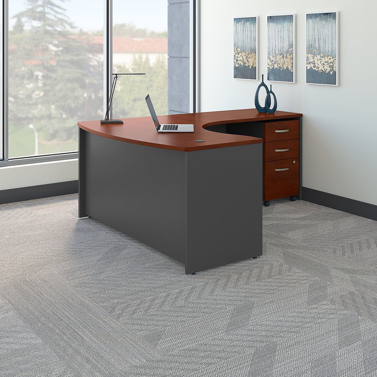 Work with the convenience you want and the durability you need. This Bush Business Furniture Westfield Right Handed L Shaped Desk makes the most of your office space with a clever construction and user-friendly features. Attractive and inviting, the Bow Front design gives guests the space they need to pull up chairs and collaborate. Spread out on the L Shaped Desk and feed your cables through wire management grommets in the surface to keep them concealed. The thermally fused laminate finish and sturdy construction provide long-lasting professional quality. Guide the Mobile File Cabinet throughout your office or store it under the L Shaped Desk to save space. Enjoy easy access to paperwork with a full-extension file drawer gliding on smooth ball bearing slides. Westfield offers endless layout options and 7 finishes. Backed by a 10 Year Warranty. American made with U.S. and imported parts.