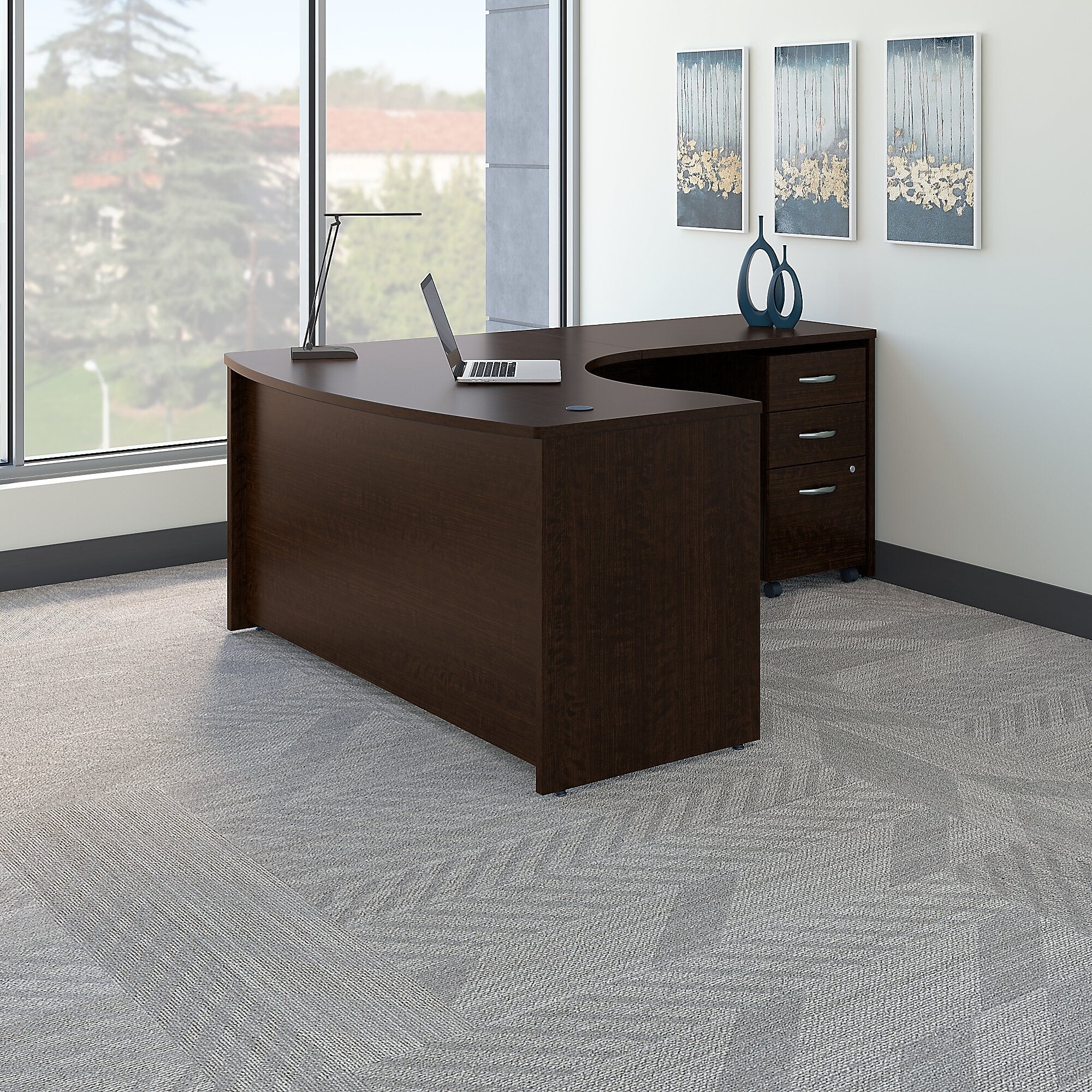 Work with the convenience you want and the durability you need. This Bush Business Furniture Westfield Right Handed L Shaped Desk makes the most of your office space with a clever construction and user-friendly features. Attractive and inviting, the Bow Front design gives guests the space they need to pull up chairs and collaborate. Spread out on the L Shaped Desk and feed your cables through wire management grommets in the surface to keep them concealed. The thermally fused laminate finish and sturdy construction provide long-lasting professional quality. Guide the Mobile File Cabinet throughout your office or store it under the L Shaped Desk to save space. Enjoy easy access to paperwork with a full-extension file drawer gliding on smooth ball bearing slides. Westfield offers endless layout options and 7 finishes. Backed by a 10 Year Warranty. American made with U.S. and imported parts.