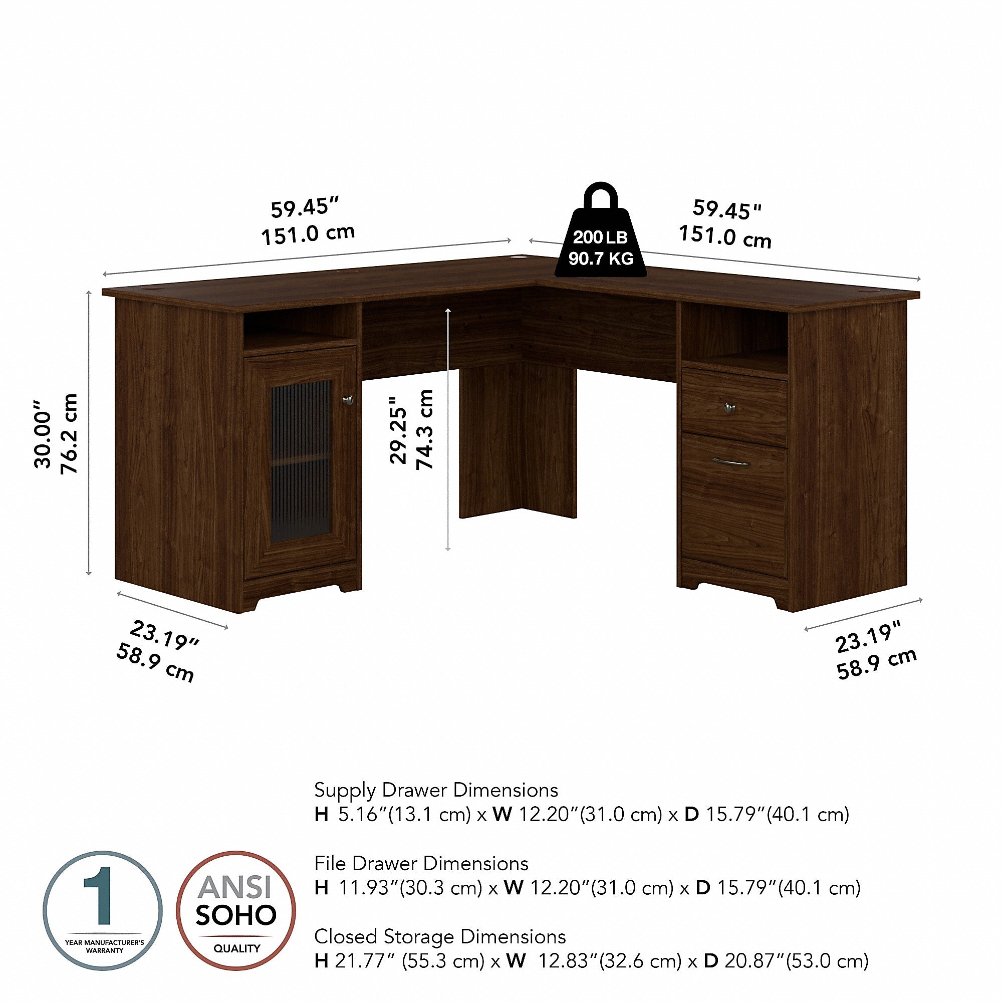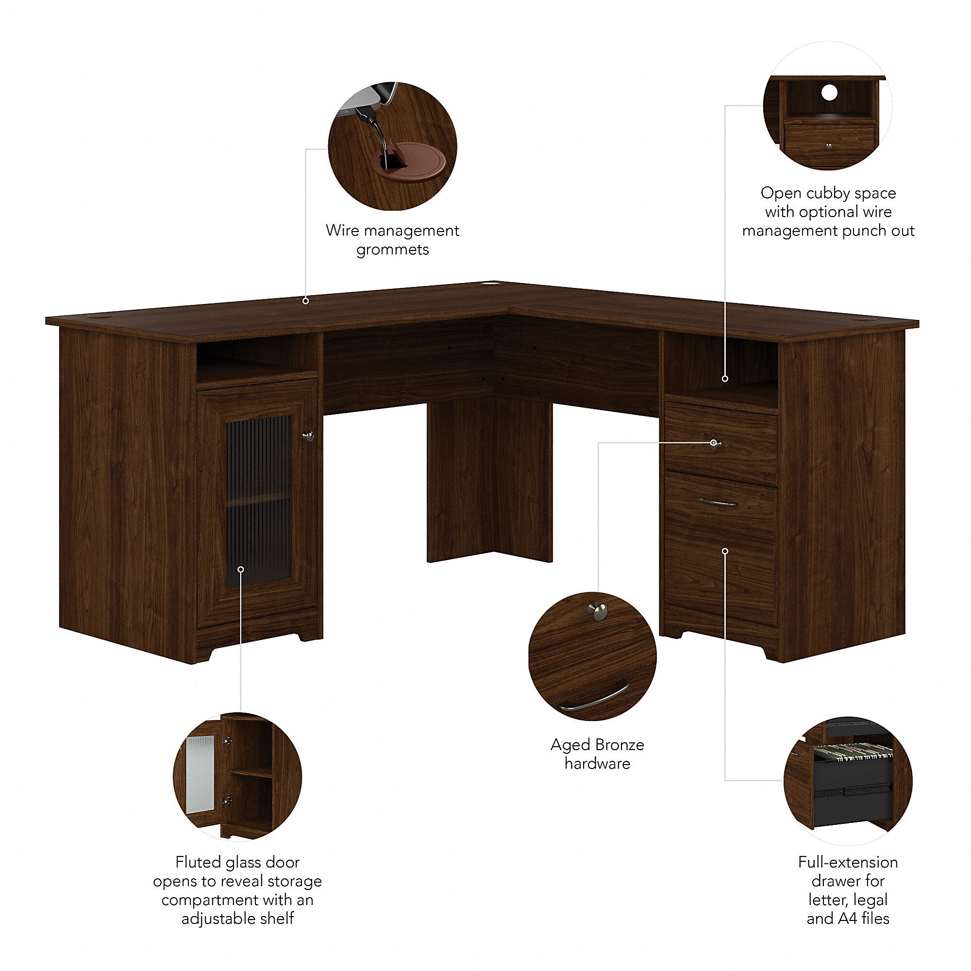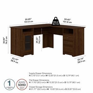 The Bush Furniture Cabot 60W L Shaped Computer Desk offers a spacious and efficient workspace for your home office. Enjoy a beautiful traditional look with smart features for your convenience. The L Shaped Desk design provides a large, durable work surface and just the right amount of storage to keep you feeling neat and organized. Storage details include an enclosed cabinet with a stylish fluted glass door and a box drawer for supplies. A file drawer opens on smooth full-extension ball bearing slides for an effortless reach to letter, legal or A4 sized paperwork. A built-in 4-port USB hub keeps your devices connected. The corner desk design saves space but provides you with 60 inches to spread out in either direction. This home office desk with storage is tested to meet ANSI/BIFMA standards for safety and performance and is backed by the Bush Furniture 1 Year Manufacturer's Warranty.