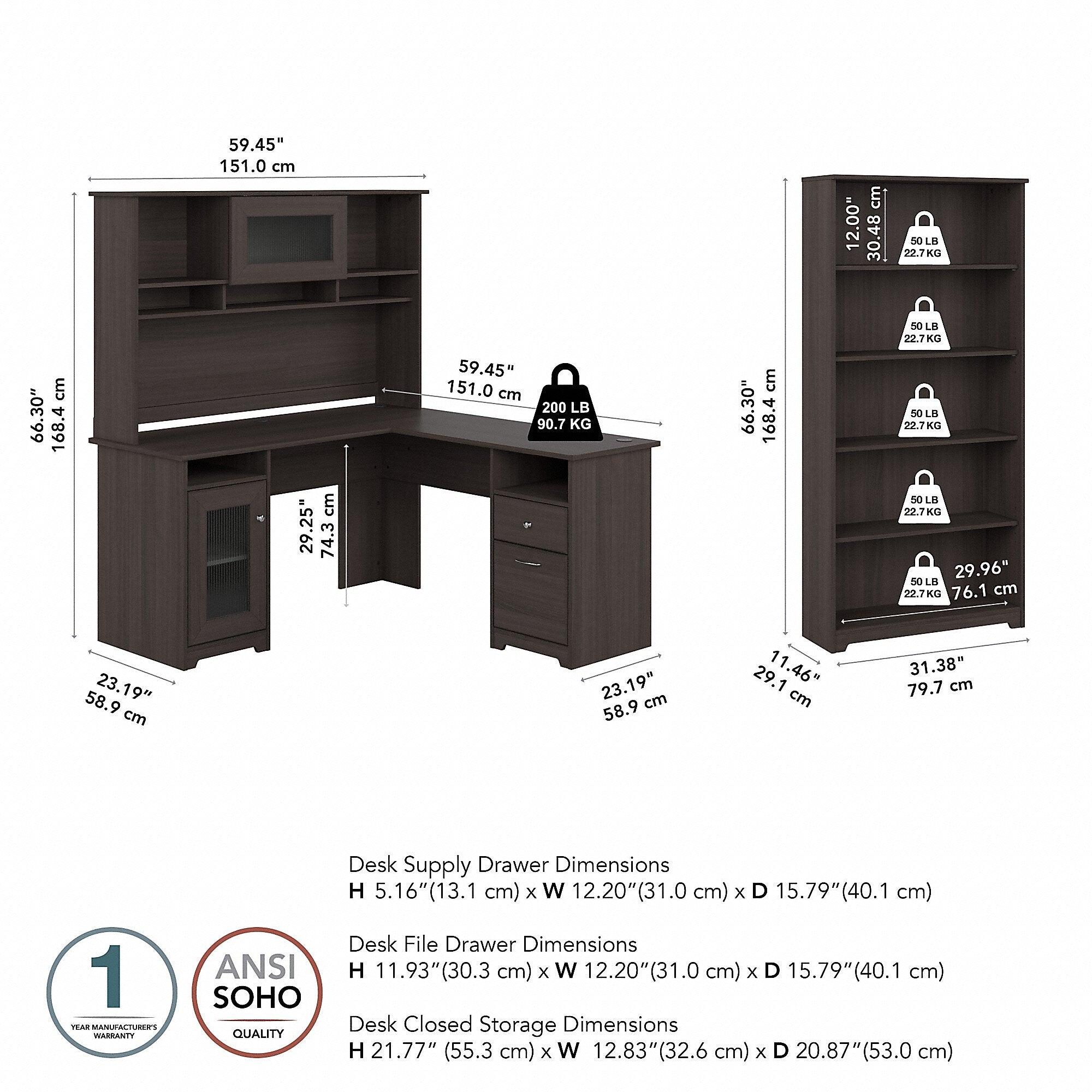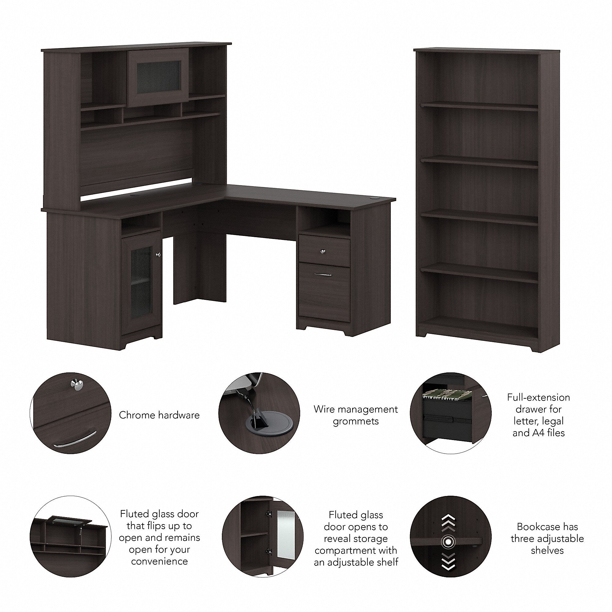 The Bush Furniture Cabot 60W L Shaped Computer Desk with Hutch and 5 Shelf Bookcase presents a home office solution with transitional style. The L Shaped Desk surface supports up to 200 pounds and includes built-in wire management to keep cords and cables out of the way. Organize materials inside a storage cabinet with an adjustable shelf while using the file drawer and box drawer to keep paperwork and office supplies close by. The Desk Hutch adds another closed compartment behind a fluted glass door along with right and left shelves for flexible storage and display. The Tall Bookcase includes three adjustable shelves to accommodate books and decorations of various sizes while two shelves are fixed for stability. This corner desk with bookshelf and hutch has been rigorously tested to meet or exceed ANSI/SOHO quality standards for safety and performance and is backed by a 1 Year Warranty.