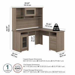 The Bush Furniture Cabot 60W L Shaped Computer Desk with Hutch and Storage presents a home office solution with transitional style. The spacious L Shaped Desk surface supports up to 200 pounds and includes built-in wire management to keep cords and cables out of the way. Organize materials and supplies inside a storage cabinet that contains one adjustable shelf. The file drawer opens on smooth full-extension ball bearing slides for an effortless reach to letter, legal, and A4-size paperwork while a smaller box drawer keeps small office supplies in order. The Desk Hutch adds another closed compartment behind a fluted glass door along with right and left shelves for flexible storage and display. This corner desk with drawers, storage cabinet, and hutch has been rigorously tested to meet or exceed ANSI/SOHO quality standards for safety and performance and is backed by a 1 Year Warranty.