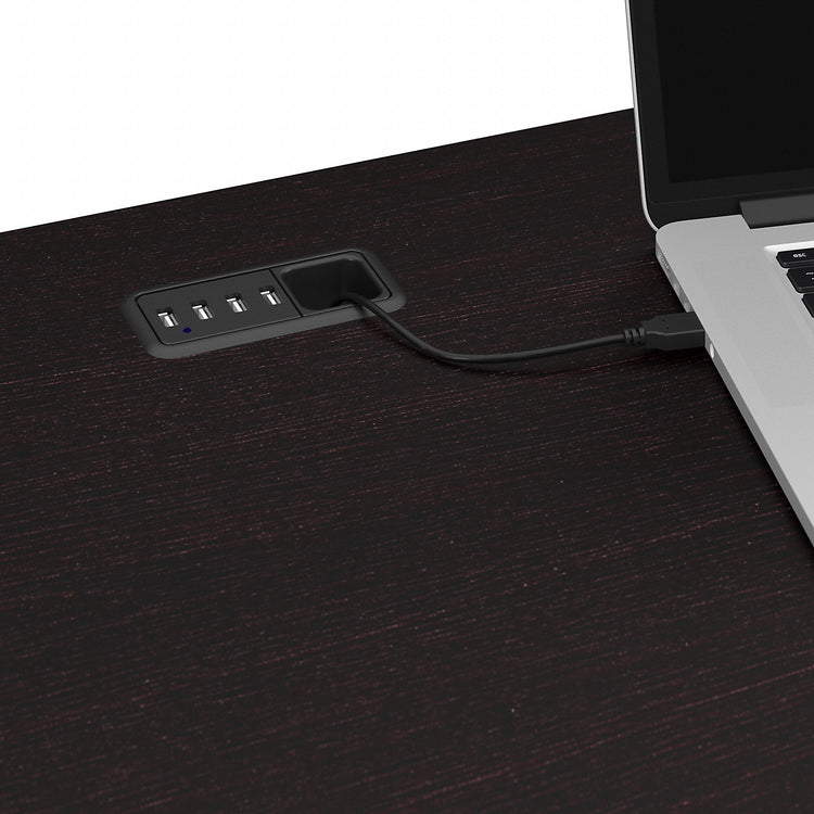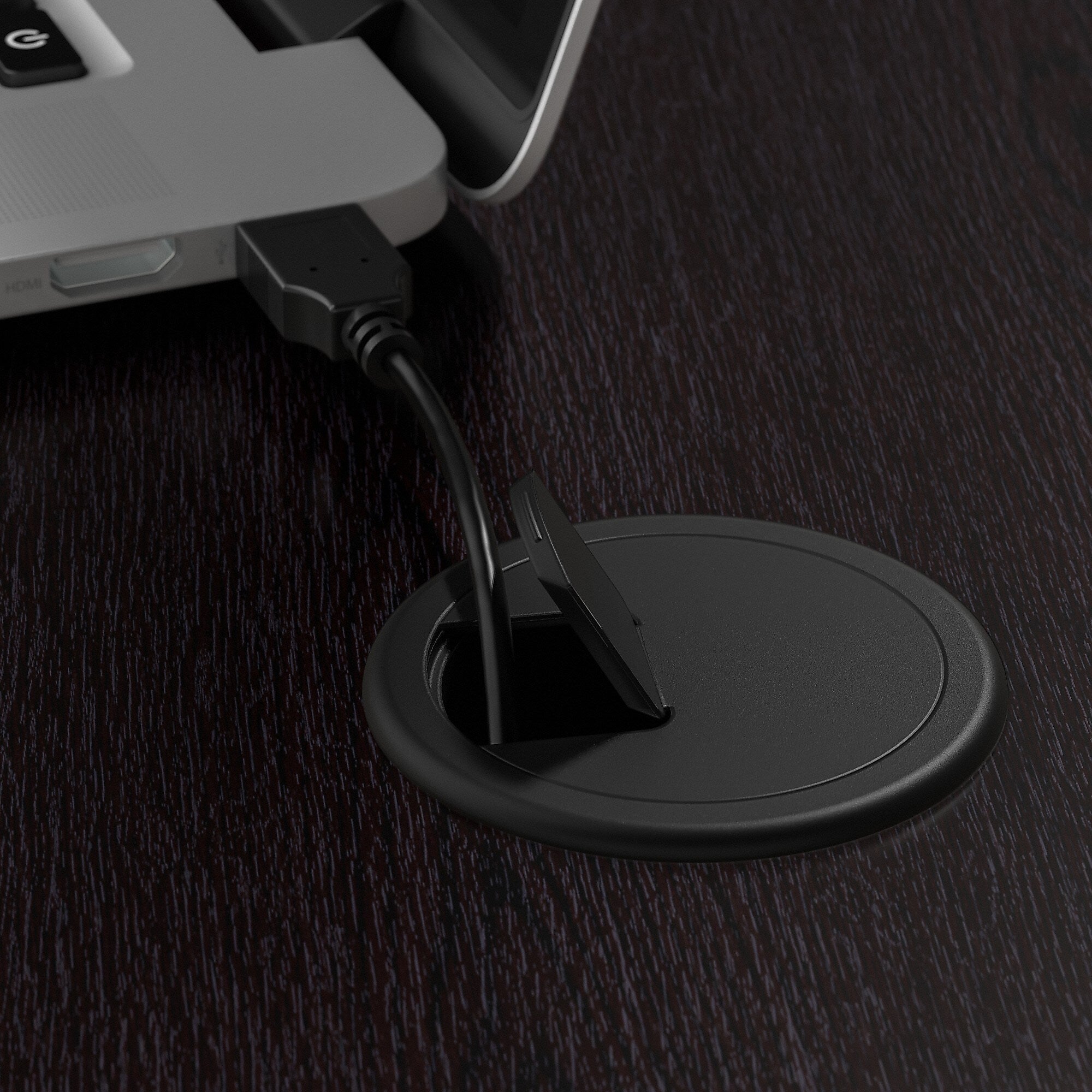 - L Desk's surface features built-in wire management grommets to keep cords and cables out of the way
