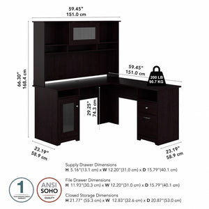 The Bush Furniture Cabot 60W L Shaped Computer Desk with Hutch and Storage presents a home office solution with transitional style. The spacious L Shaped Desk surface supports up to 200 pounds and includes built-in wire management to keep cords and cables out of the way. Organize materials and supplies inside a storage cabinet that contains one adjustable shelf. The file drawer opens on smooth full-extension ball bearing slides for an effortless reach to letter, legal, and A4-size paperwork while a smaller box drawer keeps small office supplies in order. The Desk Hutch adds another closed compartment behind a fluted glass door along with right and left shelves for flexible storage and display. This corner desk with drawers, storage cabinet, and hutch has been rigorously tested to meet or exceed ANSI/SOHO quality standards for safety and performance and is backed by a 1 Year Warranty.