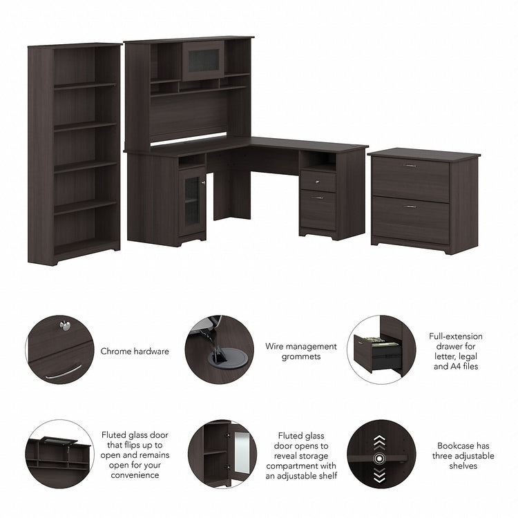 The Bush Furniture Cabot 60W L Shaped Computer Desk with Hutch, File Cabinet and Bookcase presents a home office solution with transitional style. The L Shaped Desk surface supports up to 200 pounds and includes built-in wire management to keep cords and cables out of the way. The Desk Hutch adds another closed compartment behind a fluted glass door along with right and left shelves for flexible storage and display. The lateral filing cabinet's spacious drawers open on smooth full-extension ball bearing slides for an effortless reach to letter, legal, and A4-size documents. The Tall Bookcase includes three adjustable shelves for books and decorations of various sizes while two shelves are fixed for stability. This corner desk with file cabinet and bookshelf set has been rigorously tested to meet or exceed ANSI/SOHO standards for safety and performance and is backed by a 1 Year Warranty.