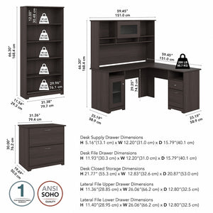 Bush Furniture Cabot 60"W L Shaped Computer Desk with Hutch, File Cabinet and Bookcase, Heather Gray (CAB010HRG)