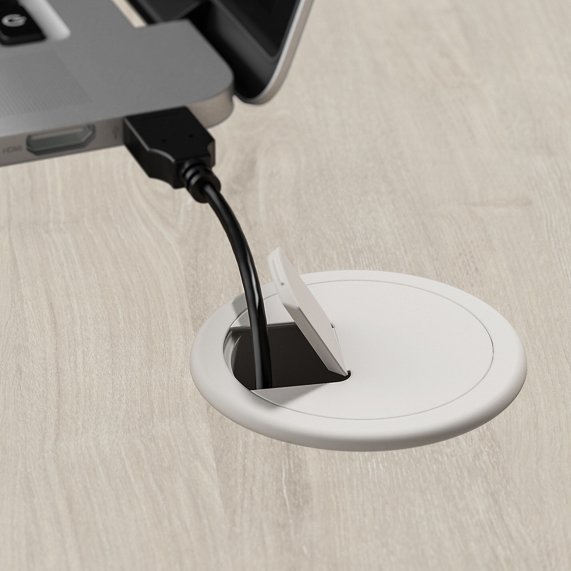 - Corner desk surface includes built-in wire management and a 4-port USB hub for connecting electronic devices