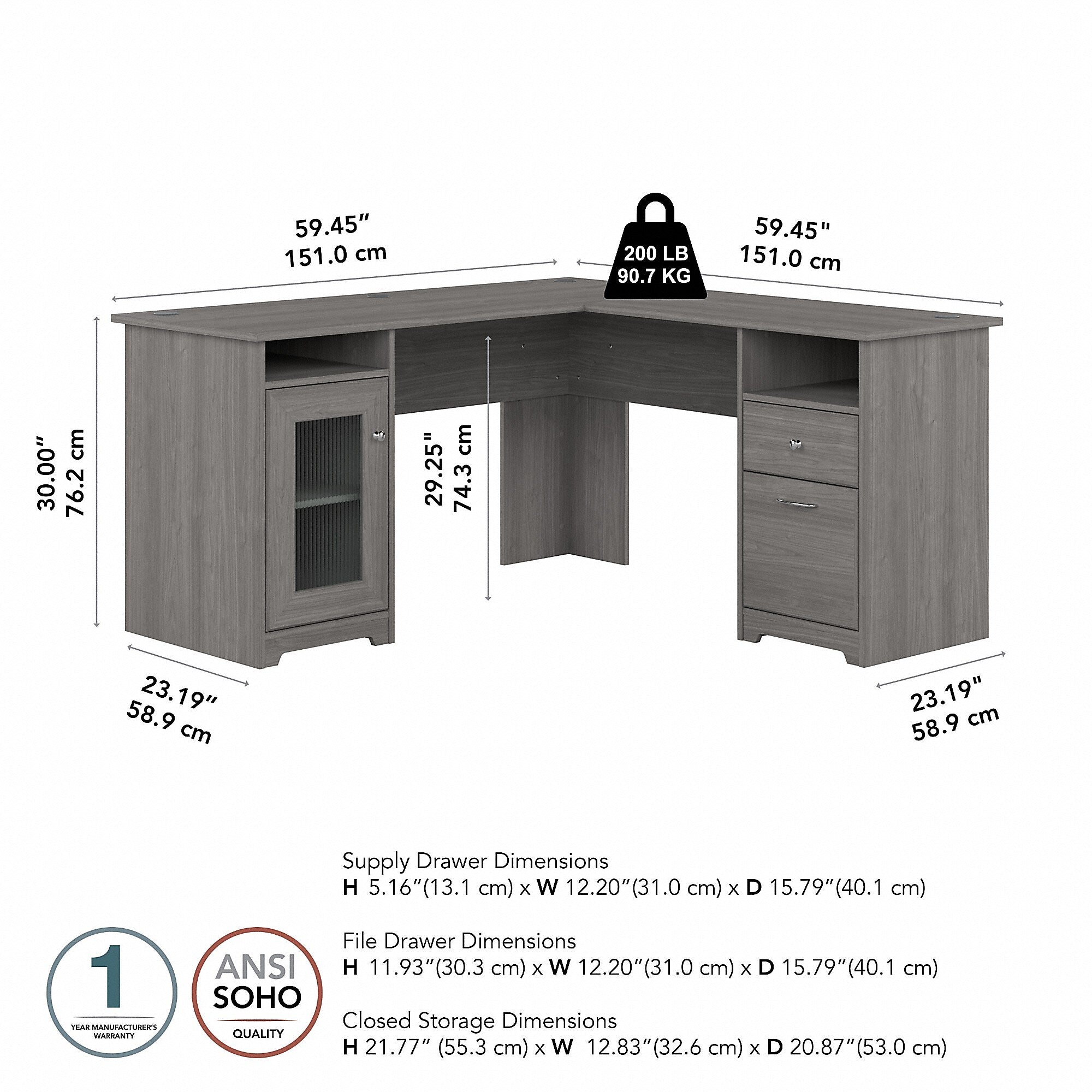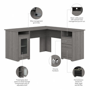 The Bush Furniture Cabot 60W L Shaped Computer Desk with Storage presents a home office solution with transitional style. Take advantage of the spacious L Shaped Desk surface to spread out with the materials you need to power through your next project or assignment. The durable desktop supports up to 200 pounds and has built-in wire management to keep cords and cables out of the way while you work. Organize materials inside a storage cabinet with one adjustable shelf behind a fluted glass door. The file drawer opens on smooth full-extension ball bearing slides for an effortless reach to letter, legal, and A4-size paperwork. A box drawer and two open cubby spaces are ideal for work-in-progress and frequently used items. This corner desk with drawers and storage has been rigorously tested to meet or exceed ANSI/SOHO standards for safety and performance and is backed by a 1 Year Warranty.