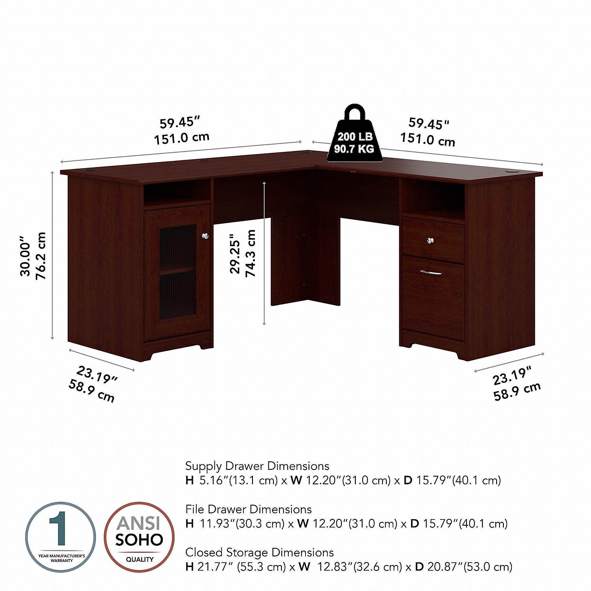 The Bush Furniture Cabot 60W L Shaped Computer Desk with Storage presents a home office solution with transitional style. Take advantage of the spacious L Shaped Desk surface to spread out with the materials you need to power through your next project or assignment. The durable desktop supports up to 200 pounds and has built-in wire management to keep cords and cables out of the way while you work. Organize materials inside a storage cabinet with one adjustable shelf behind a fluted glass door. The file drawer opens on smooth full-extension ball bearing slides for an effortless reach to letter, legal, and A4-size paperwork. A box drawer and two open cubby spaces are ideal for work-in-progress and frequently used items. This corner desk with drawers and storage has been rigorously tested to meet or exceed ANSI/SOHO standards for safety and performance and is backed by a 1 Year Warranty.