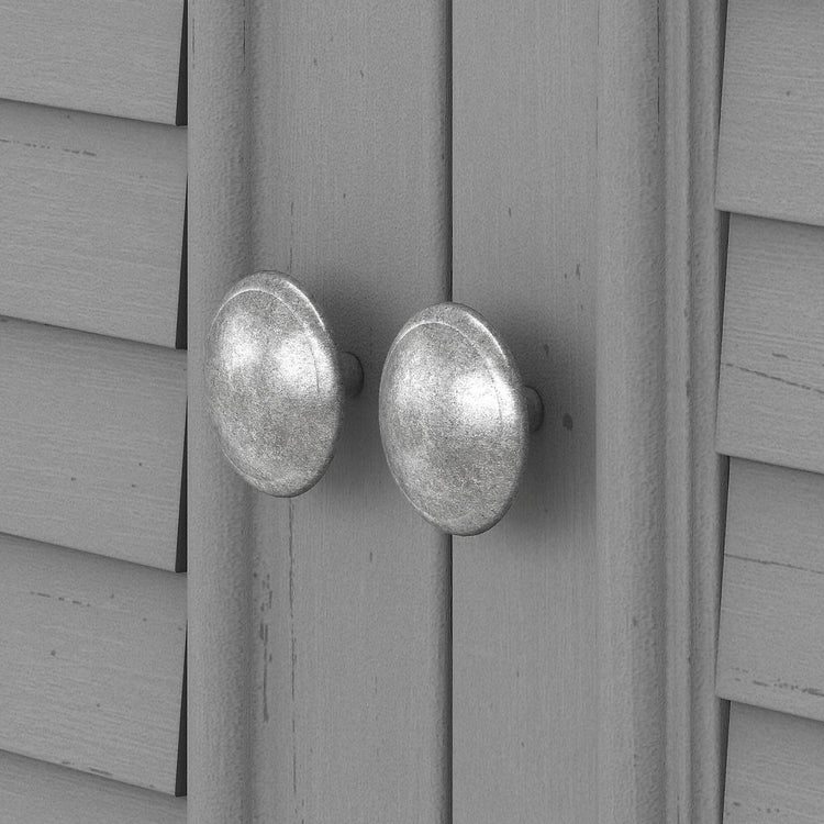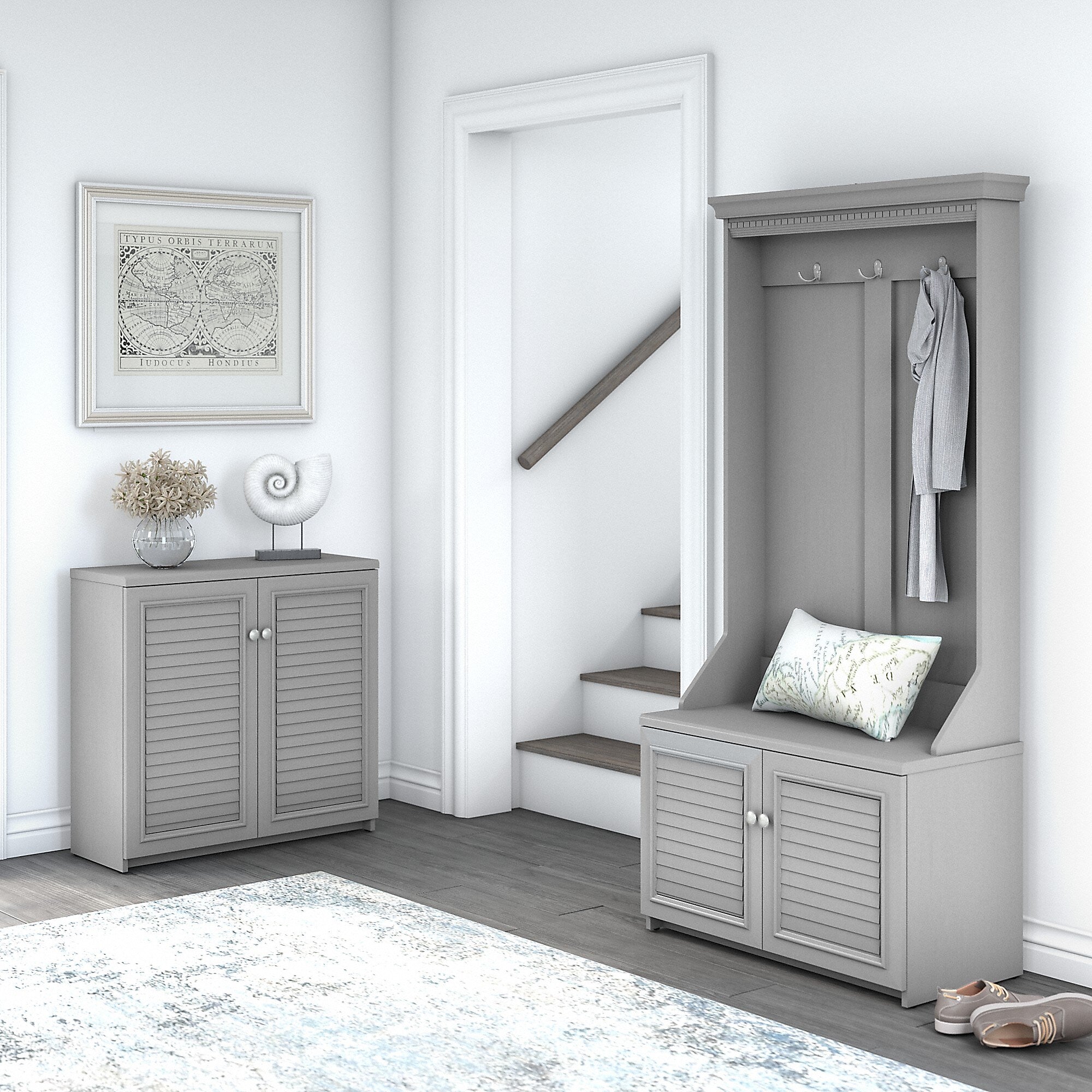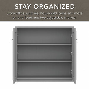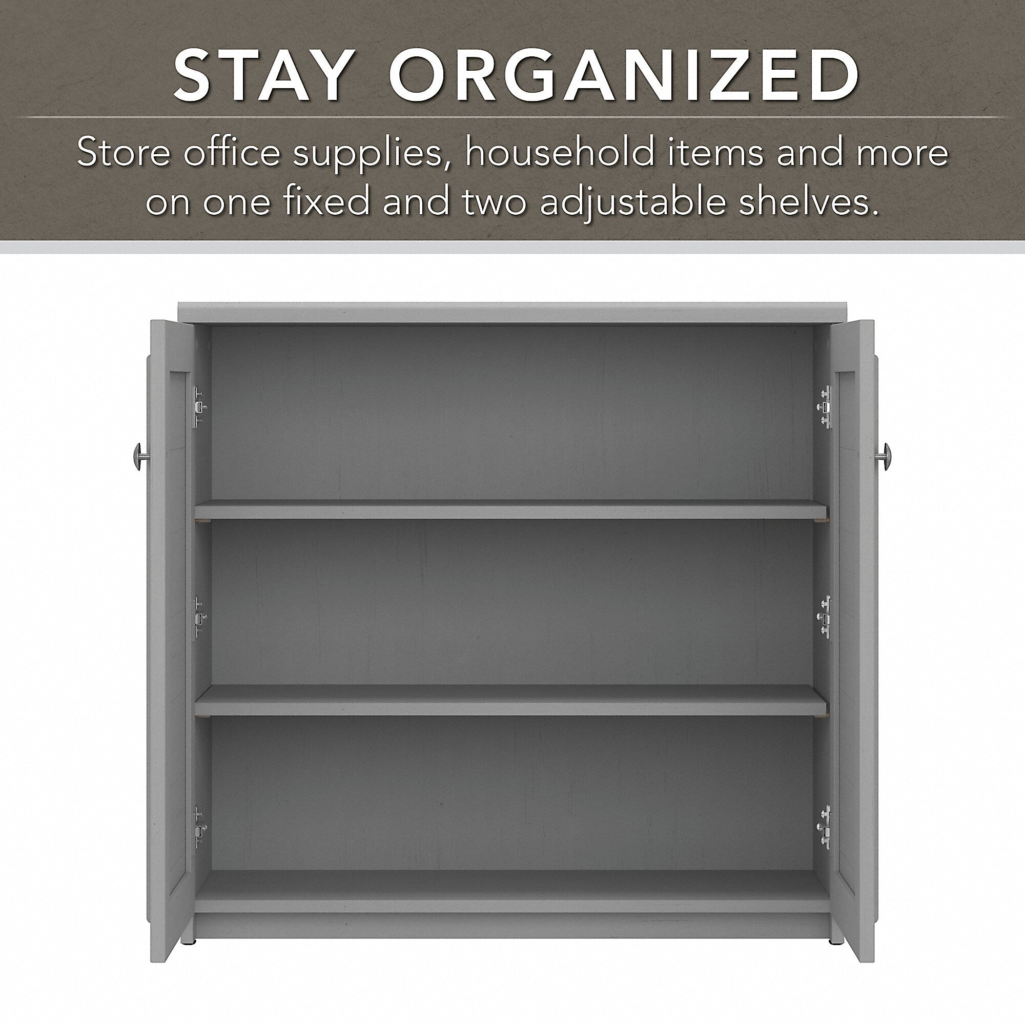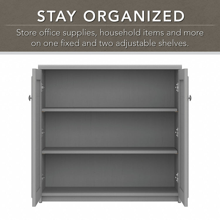 The Bush Furniture Fairview small storage cabinet with doors and shelves is a great way to organize any home office or living space while invoking the cozy, welcoming charm of modern farmhouse styling. A slightly weathered finish pairs nicely with Antique Pewter hardware to create a casual appearance, and durable construction promises to withstand years of regular use. This multipurpose accent cabinet features stylish louvered doors that conceal three shelves, two of which can be raised or lowered to accommodate items of various sizes. The compact design works well in small spaces while still providing ample storage capacity, making the two-door cabinet a good fit for an entryway, office, or living room. This farmhouse cabinet is tested to meet ANSI/SOHO quality standards for safety and performance and is backed by the 6-year manufacturer limited warranty.