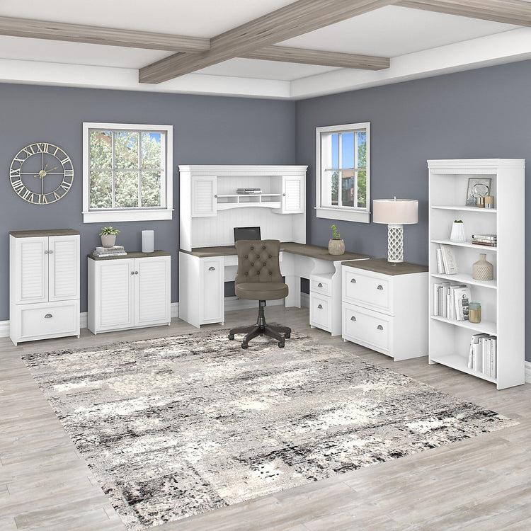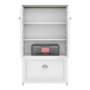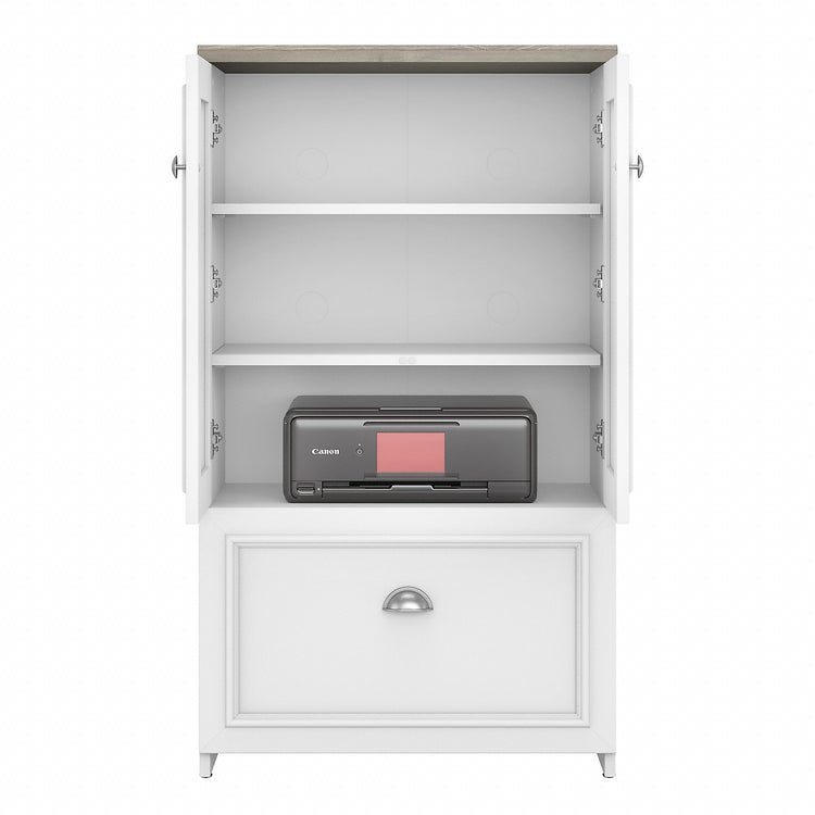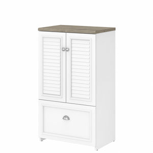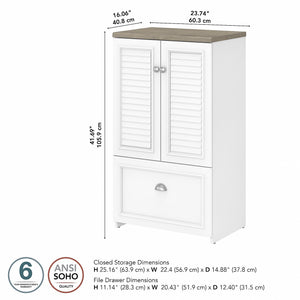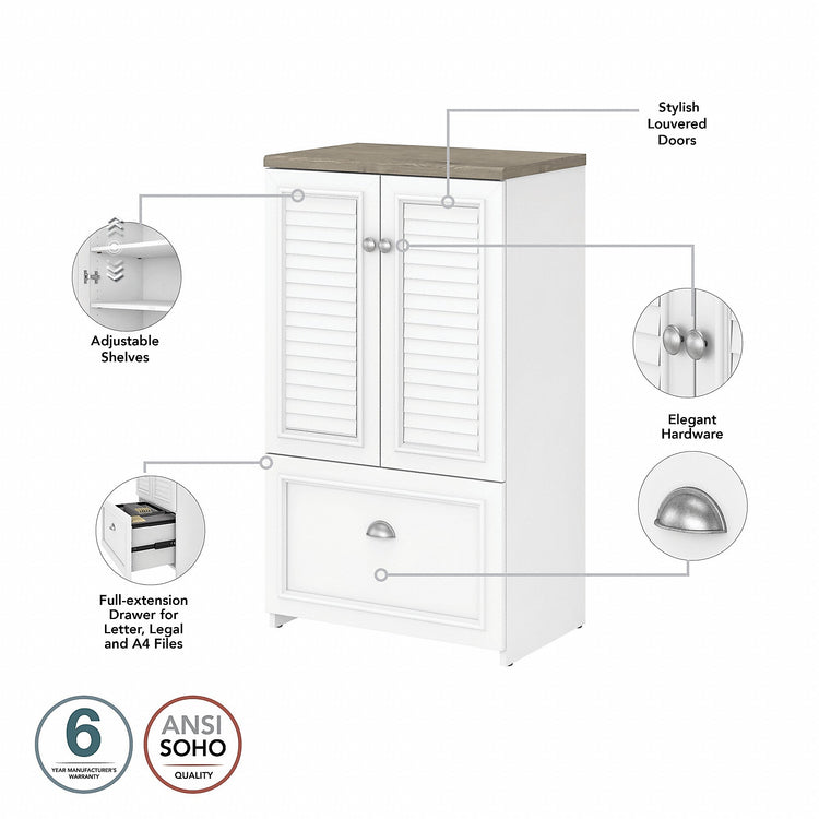 The Bush Furniture Fairview two-door storage cabinet with file drawer is a great way to organize any home office or living space while invoking the cozy, welcoming charm of modern farmhouse styling. Slightly weathered finish pairs with antique pewter hardware to create a casual appearance and durable construction promises to withstand years of regular use. This versatile accent cabinet features stylish louvered doors that conceal three shelves, two of which can be adjusted to store items of various sizes. The file drawer opens on full-extension ball-bearing slides for an effortless reach to letter-, legal-, and A4-size paperwork. The back panel has punched-out holes for wire management and ventilation, making it an ideal choice for storing your laptop and other devices. This farmhouse cabinet is tested to meet ANSI/SOHO standards for safety and performance and is backed by a 6-year warranty.