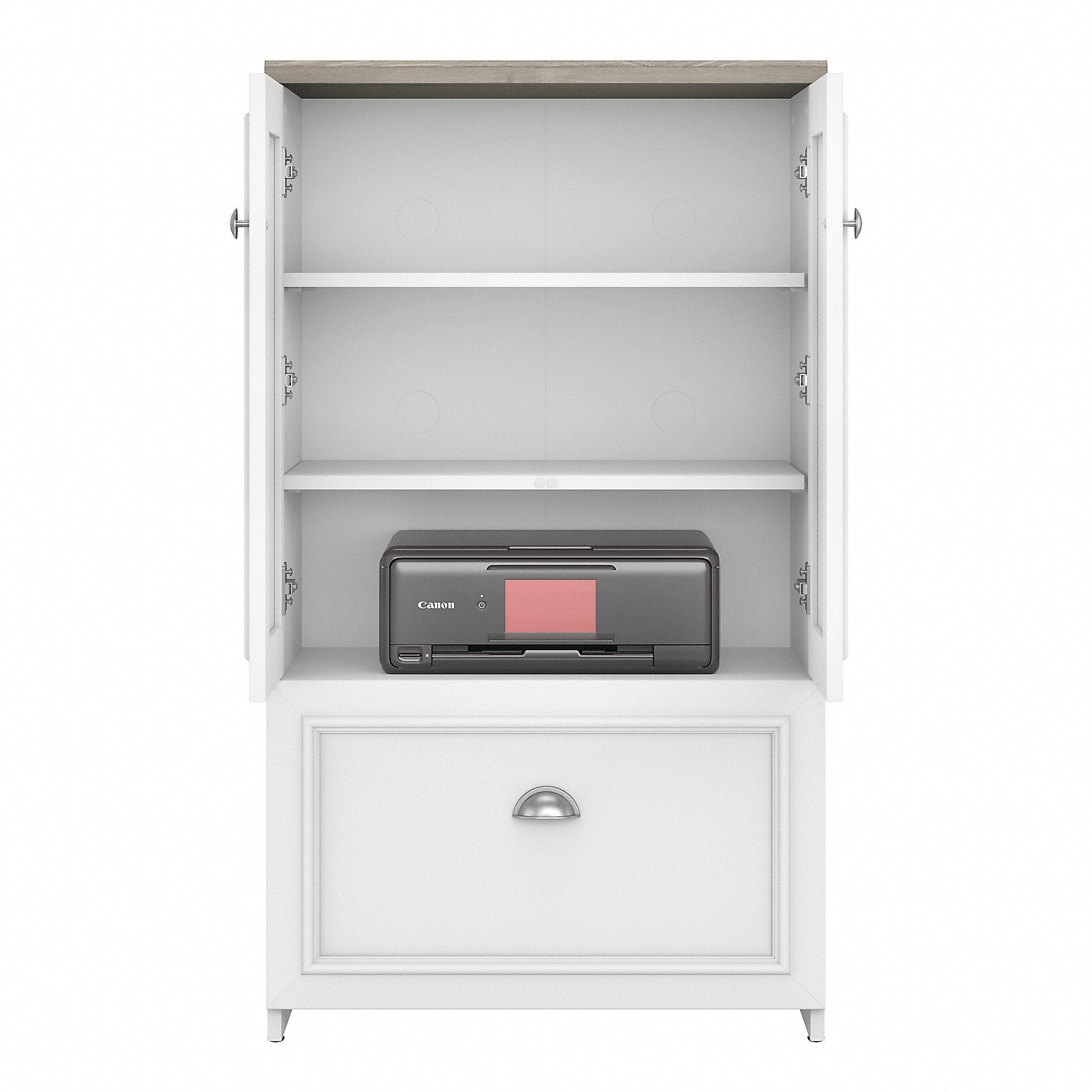 - Two-door storage cabinet with file drawer is great for organizing virtually any home office or living space