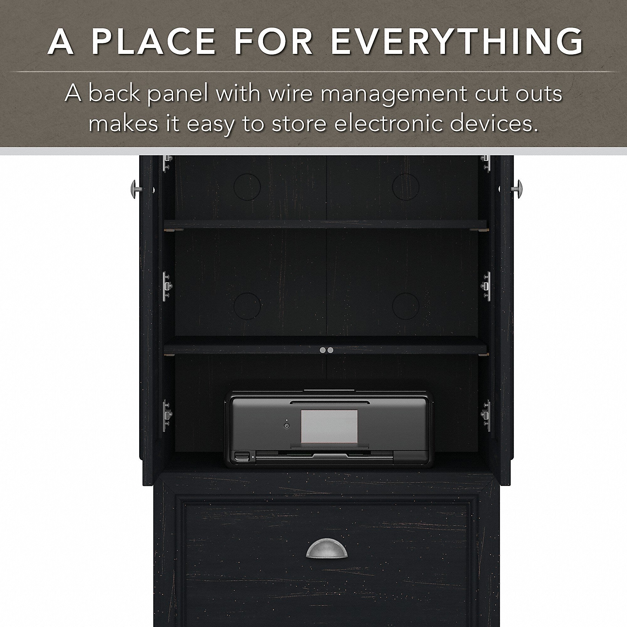 - Two-door cabinet with drawer offers even more concealed storage for miscellaneous items you want kept in order but out of sight