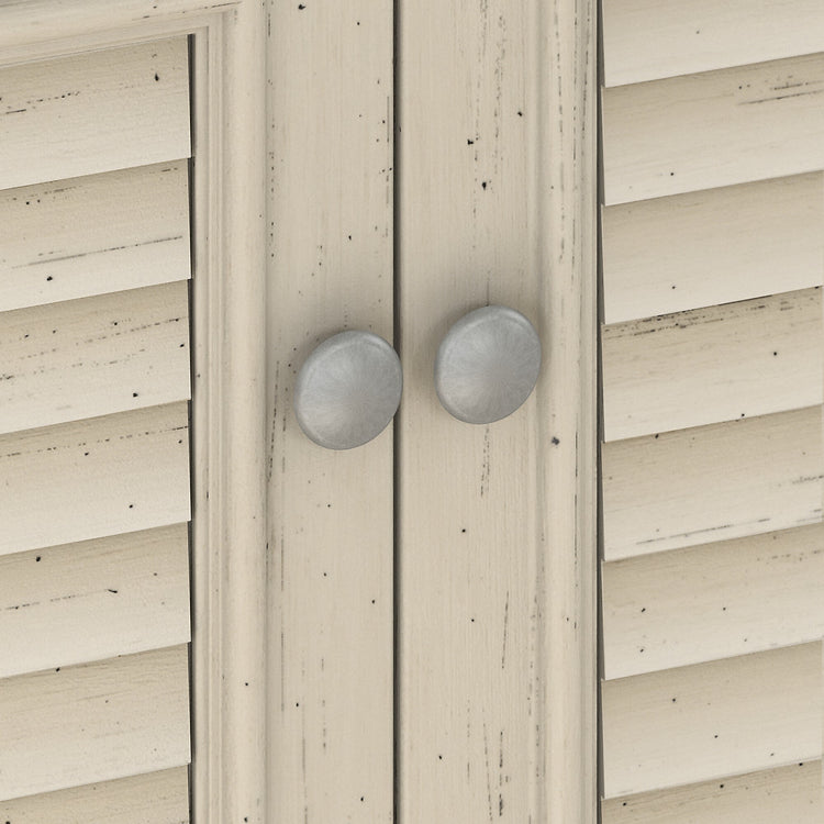 With its practical design and casual appearance, the Bush Furniture Fairview Small Storage Cabinet with Doors offers a versatile solution to organizing your home. A slightly weathered finish with Antique Pewter hardware invokes the welcoming charm of modern farmhouse style, while a durable build and functional features ensure long lasting appeal. The low profile design works well in small spaces while still providing ample storage, making this accent cabinet a good fit for any room. Elegant louvered doors on Euro style hinges open to reveal 3 shelves, 2 of which can be adjusted to hold items of different sizes. The top of the 2 door Storage Cabinet offers a sturdy surface with enough space to display your favorite trinkets and mementos. This organizer has been tested to meet ANSI/SOHO standards for safety and performance and is backed by the Bush Furniture 6 Year Manufacturer's Warranty.
