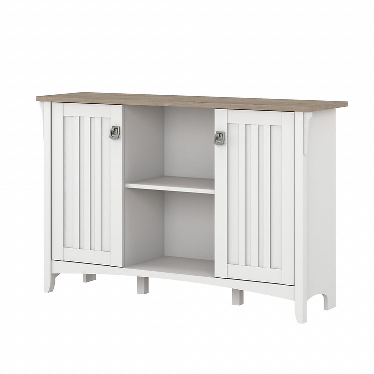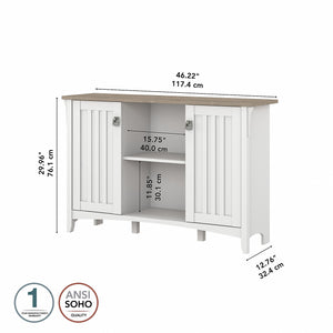 Complement the casual feel of your home with a storage solution designed for your convenience and comfort. The Bush Furniture Salinas accent storage cabinet with doors blends unique details and adjustable features for use in a variety of spaces. Complete your home office, hallway, entryway, or living room with this casual two-door cabinet featuring open and concealed storage. Place your favorite pictures, plants, or a lamp on the spacious top while showing off additional decorations in the open cubby space below. Inspired by timeless Mission style, the doors with vertical wood accents and elegant tumbled pewter hardware conceal any items you don't want out in the open. This storage cabinet contains two adjustable shelves, one behind each door. The storage cabinet with doors is tested to meet ANSI/SOHO quality standards for safety and performance and is backed by a 1-year manufacturer limited warranty.
