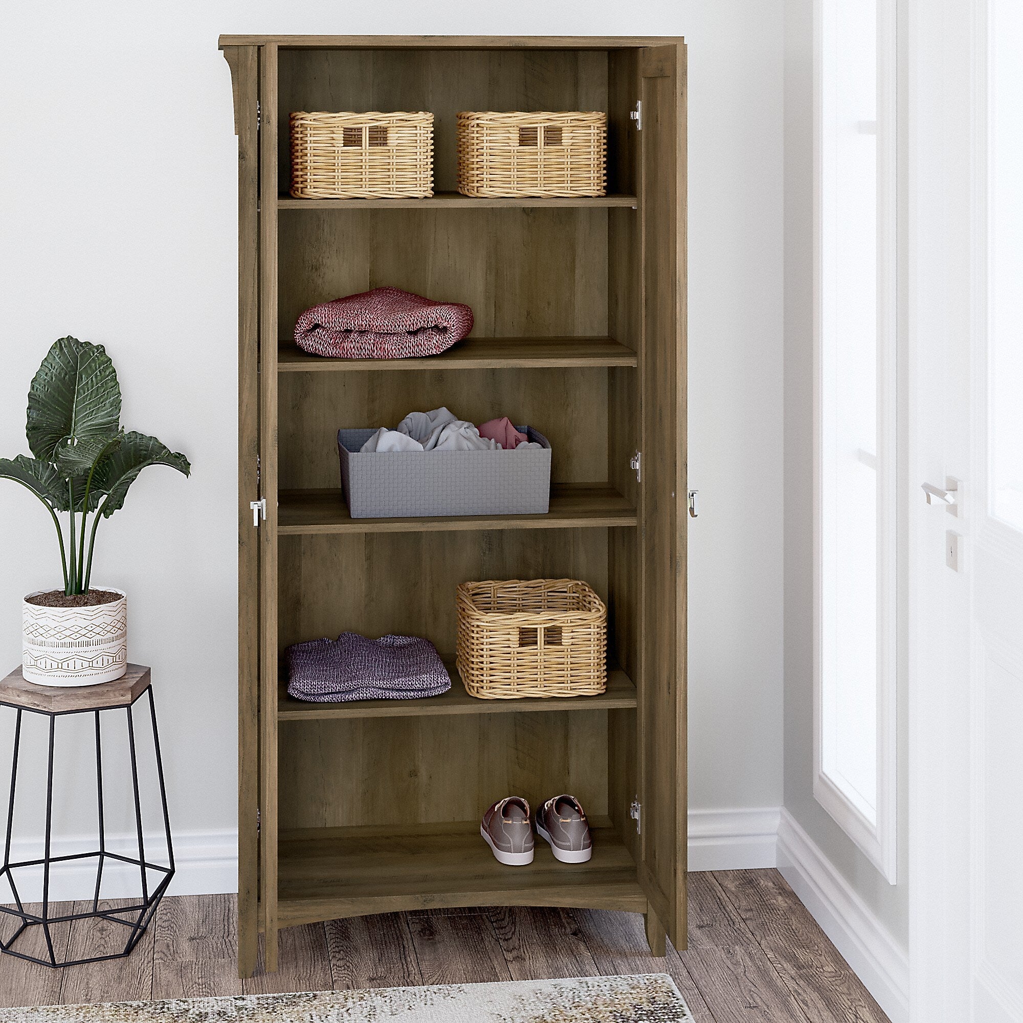 Organize your home with a storage cabinet that combines casual style with a convenient, versatile design. The Bush Furniture Salinas tall storage cabinet with doors features four concealed shelves for keeping household items, office supplies, and entertainment essentials in order and out of sight. Three adjustable shelves accommodate bulky items, such as binders and photo albums, while the one remaining shelf is fixed for stability. Each shelf supports up to 25 lbs., so you can confidently store larger materials. This floor cabinet makes a great addition to virtually any residential space. This tall two-door storage cabinet is tested to meet ANSI/SOHO standards for safety and performance and is backed by a 1-year manufacturer limited warranty.