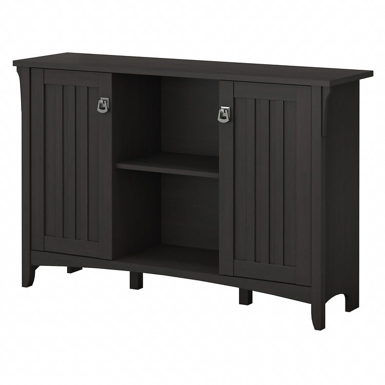 Complement the casual feel of your home with a Cabinet designed for your convenience and comfort. The Bush Furniture Salinas Storage Cabinet with Doors blends unique details and adjustable features for use in a variety of spaces. Complete your home office, hallway, bedroom or living room with a casual 2 door Cabinet featuring open and concealed storage. Place your favorite pictures, plants or a lamp on the spacious top while showing off additional knickknacks in the open cubby shelves below. Inspired by timeless Mission style, doors with vertical wood accents and elegant metal hardware conceal any items you don't want out in the open. The black Cabinet contains 2 adjustable shelves, 1 behind each door. Tapered legs and curved base rails join the slightly distressed Vintage Black finish to provide a comfortable country feel. Backed by a 1 Year Warranty.