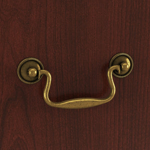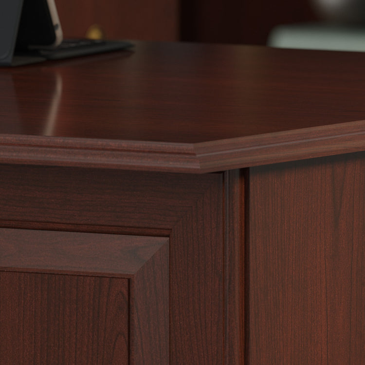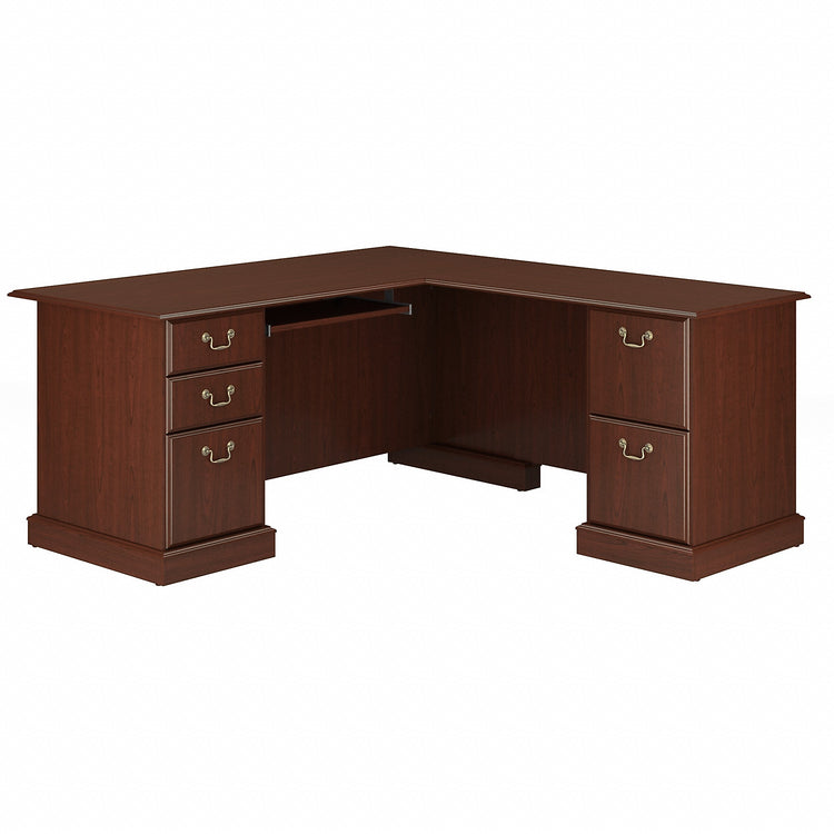 The Bush Furniture Saratoga L Shaped Computer Desk offers luxurious looks at a lasting value. Pen letters, pay bills or outfit your professional-grade home or private office with a traditional L Shaped Desk built for everyday use. The thermally fused laminate surface lasts for years while resisting scratches and stains to protect the warm Harvest Cherry finish. Enjoy all the workspace you need to multitask on the L Shaped Desk, which can be assembled for left or right-handed users. Gold-finished Brass hardware and timeless design accents match the traditional styling of your home office or workspace. Not just for looks, the Computer Desk includes a wide retracting keyboard shelf and three full-extension file drawers, which open on smooth ball-bearing slides. Two box drawers hold office supplies. Backed by a 10 Year Warranty, Saratoga meets ANSI/BIFMA performance and safety standards.