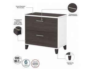 - Two-drawer lateral file cabinet has interlocking mechanism to reduce the likelihood of tipping