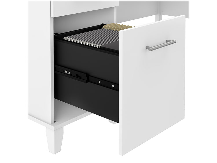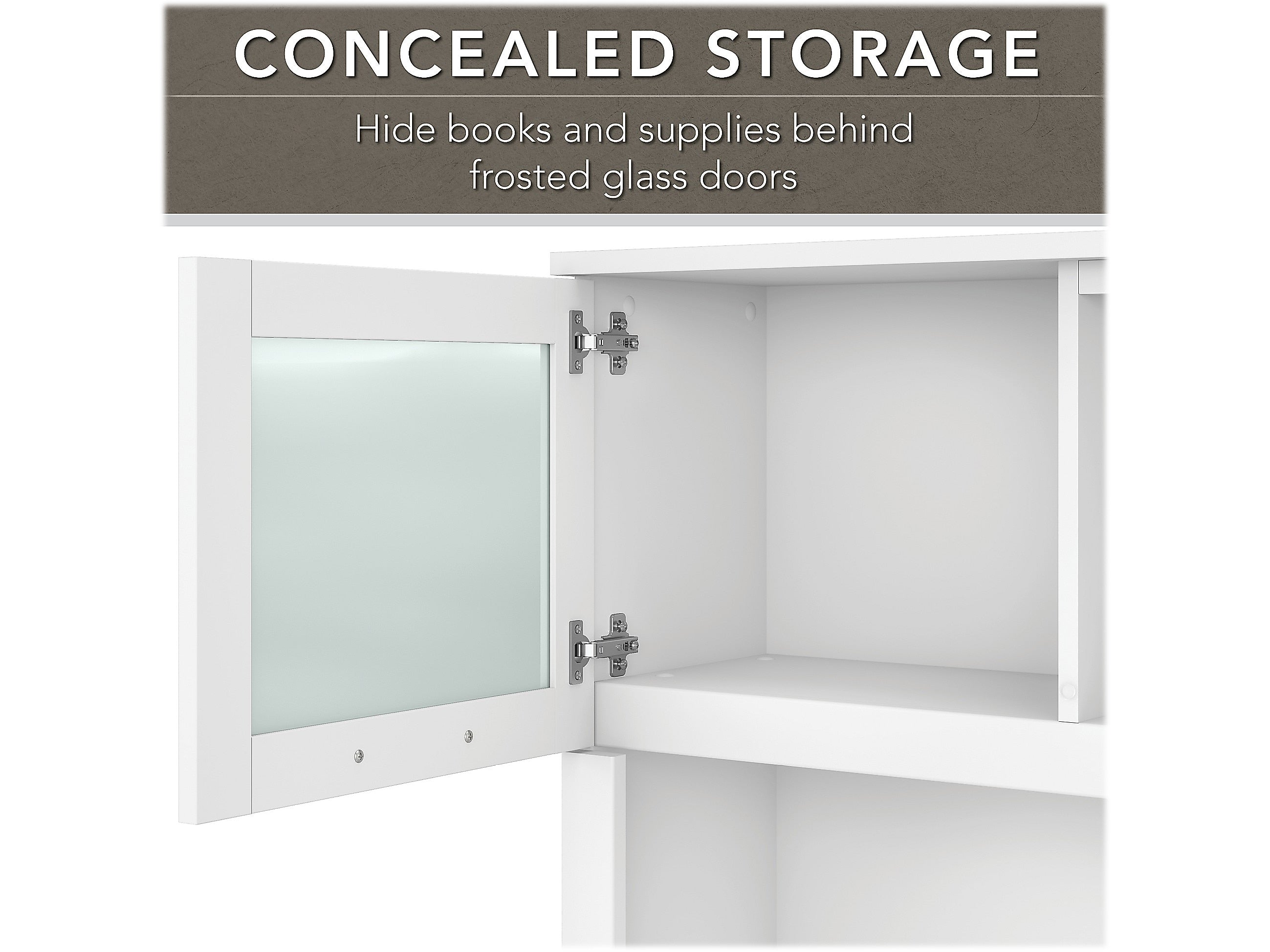 The transitional Bush Furniture Somerset 60"W L-shaped desk with hutch offers a stylish and practical workspace solution for the home or small office. Create your remote work headquarters with space for a computer, a phone, a printer, and more. A convenient pull-out shelf provides a perfect place to keep a keyboard or laptop, while a storage cabinet and a box drawer offer plenty of storage for supplies. A file drawer with ball bearing slides allows for easy access to letter-size documents. Wire management slots help keep cords and cables in order. The hutch features open storage with a large compartment for books or decorations, an adjustable shelf to hold work in progress, and two frosted glass doors that provide concealed storage. This home office furniture set is tested to meet ANSI/SOHO standards for safety and performance and is backed by the Bush Furniture 6-year manufacturer warranty. American-made with US and imported parts.