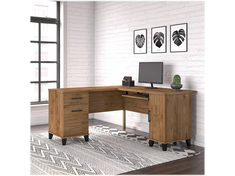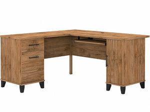 Maximize the potential of your home office with the Bush Furniture Somerset 60"W L-shaped desk. Create your remote work headquarters with space for a computer, phone, printer, and more on a surface that features wire management slots for keeping cords and cables in order. A convenient pull-out shelf provides a perfect place to keep a keyboard or laptop, and the desk also includes a vertical storage cabinet with an adjustable shelf. Place pens, paper, and more in the box drawer, and enjoy a file drawer gliding on smooth, ball-bearing slides for an easy reach to documents. Transitional styling includes a stylish finish with tapered legs and contemporary metal hardware for an alluring appearance. This desk with storage is tested to meet ANSI/SOHO standards for safety and performance and is backed by the 6-year manufacturer warranty. American-made with US and imported parts.