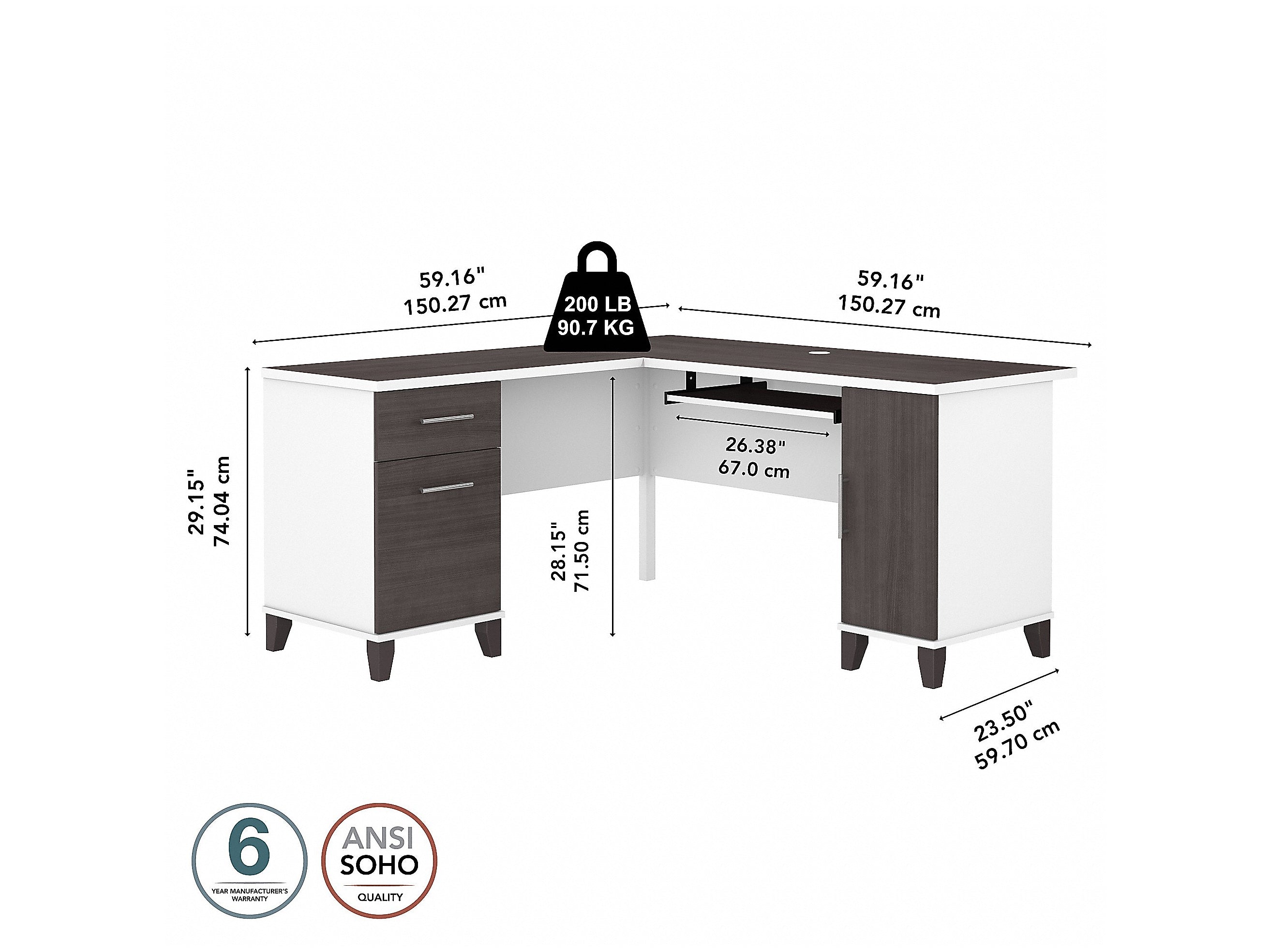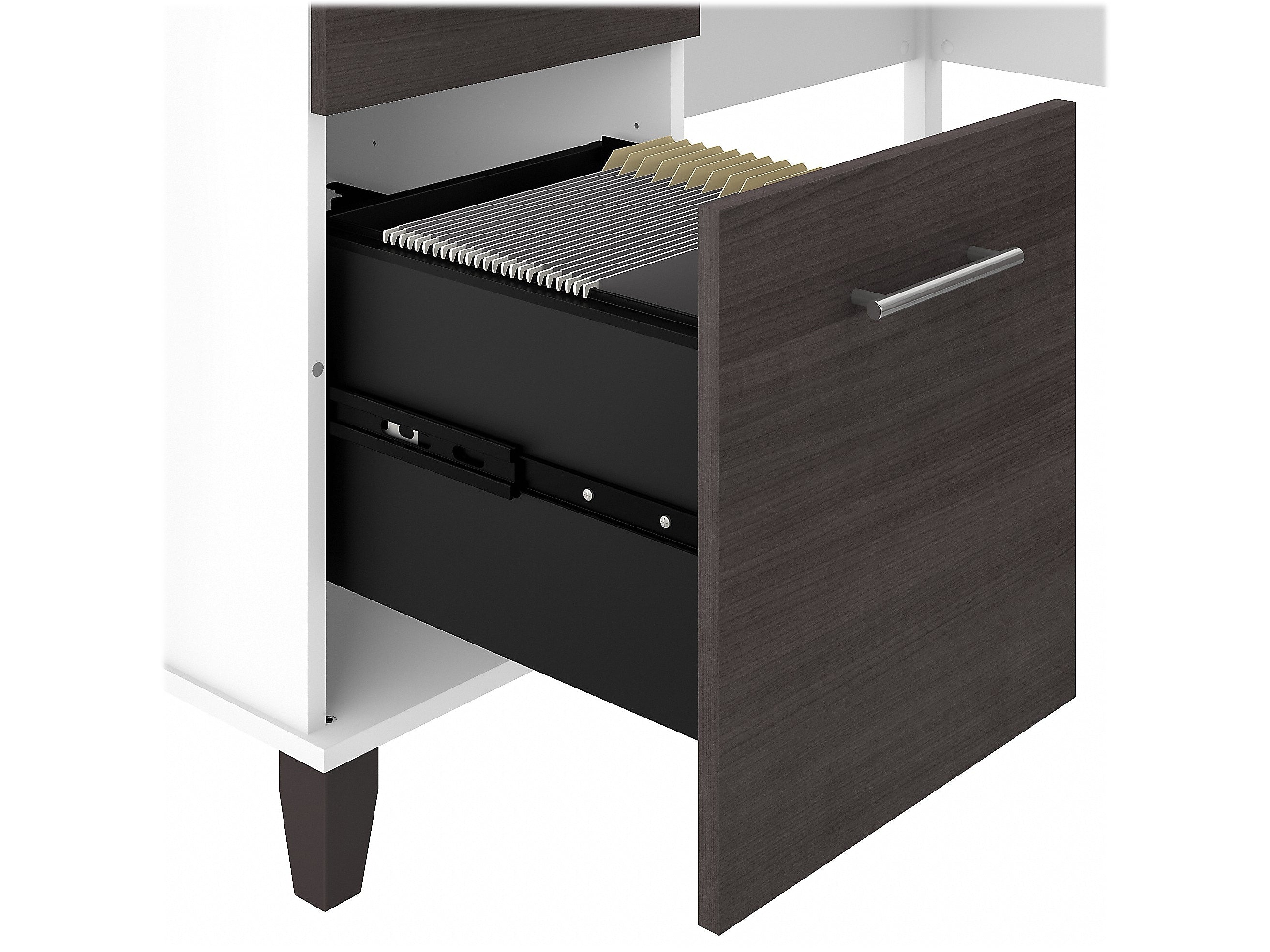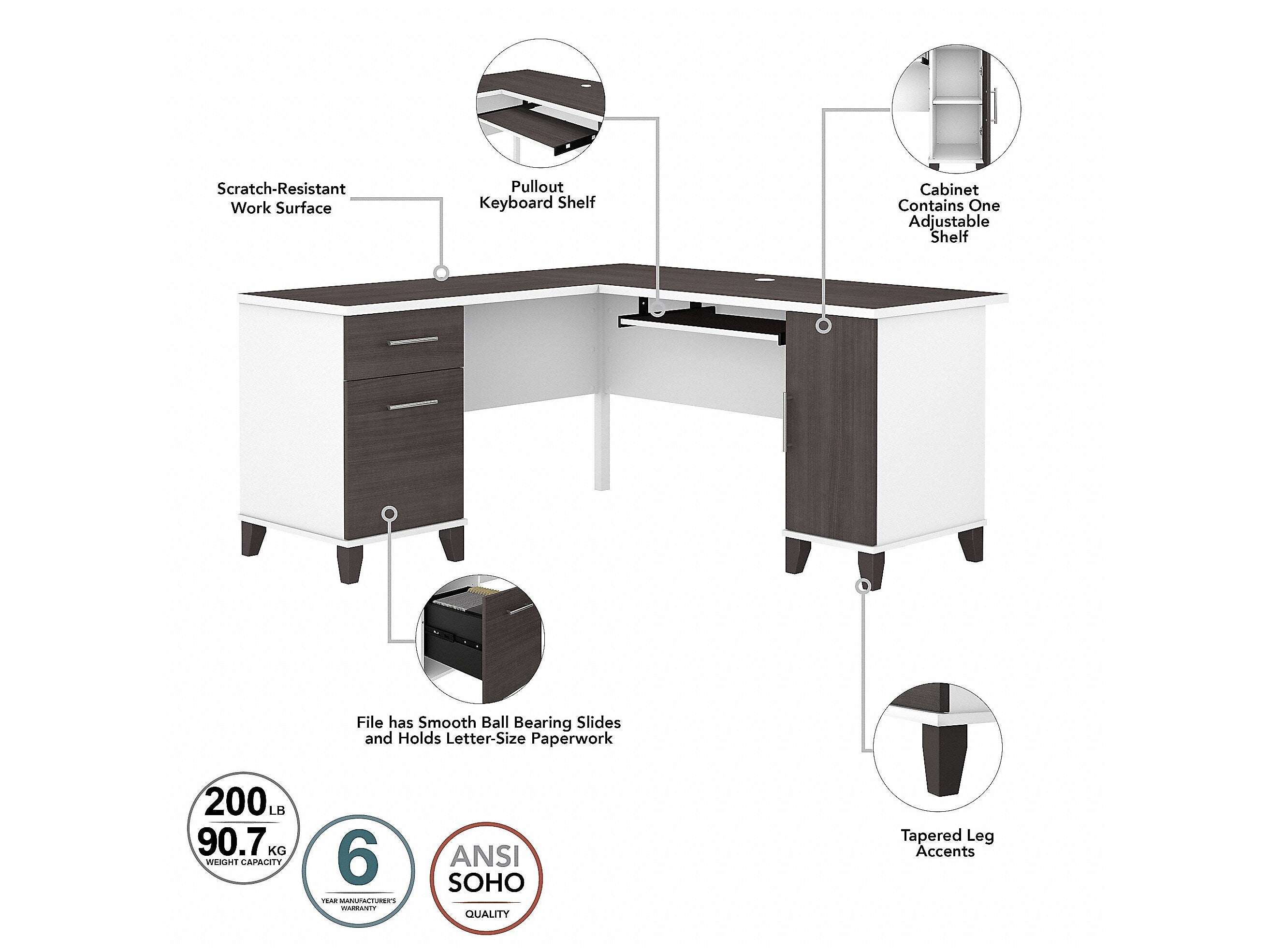 Maximize the potential of your home office with the Bush Furniture Somerset 60"W L-shaped desk. Create your remote work headquarters with space for a computer, phone, printer, and more on a surface that features wire management slots for keeping cords and cables in order. A convenient pull-out shelf provides a perfect place to keep a keyboard or laptop, and the desk also includes a vertical storage cabinet with an adjustable shelf. Place pens, paper, and more in the box drawer, and enjoy a file drawer gliding on smooth, ball-bearing slides for an easy reach to documents. Transitional styling includes a stylish finish with tapered legs and contemporary metal hardware for an alluring appearance. This desk with storage is tested to meet ANSI/SOHO standards for safety and performance and is backed by the 6-year manufacturer warranty. American-made with US and imported parts.