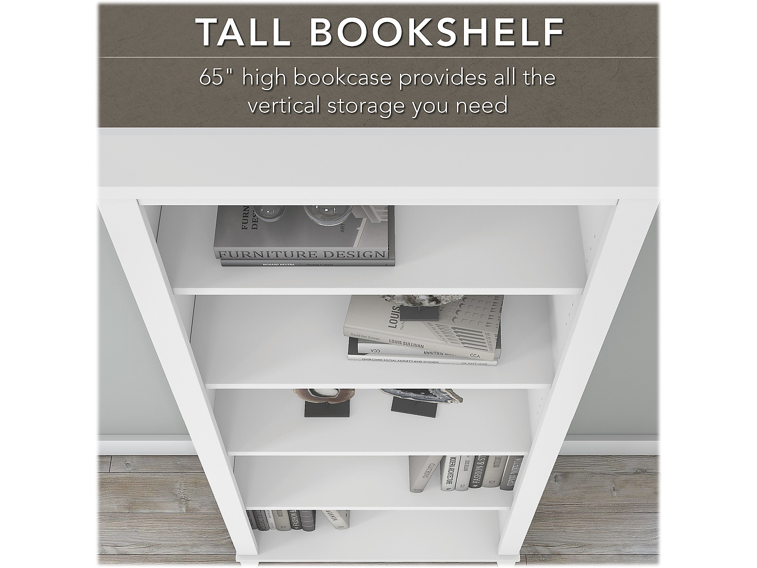 - Bookcase has two fixed shelves for stability and three adjustable shelves for flexible storage and display