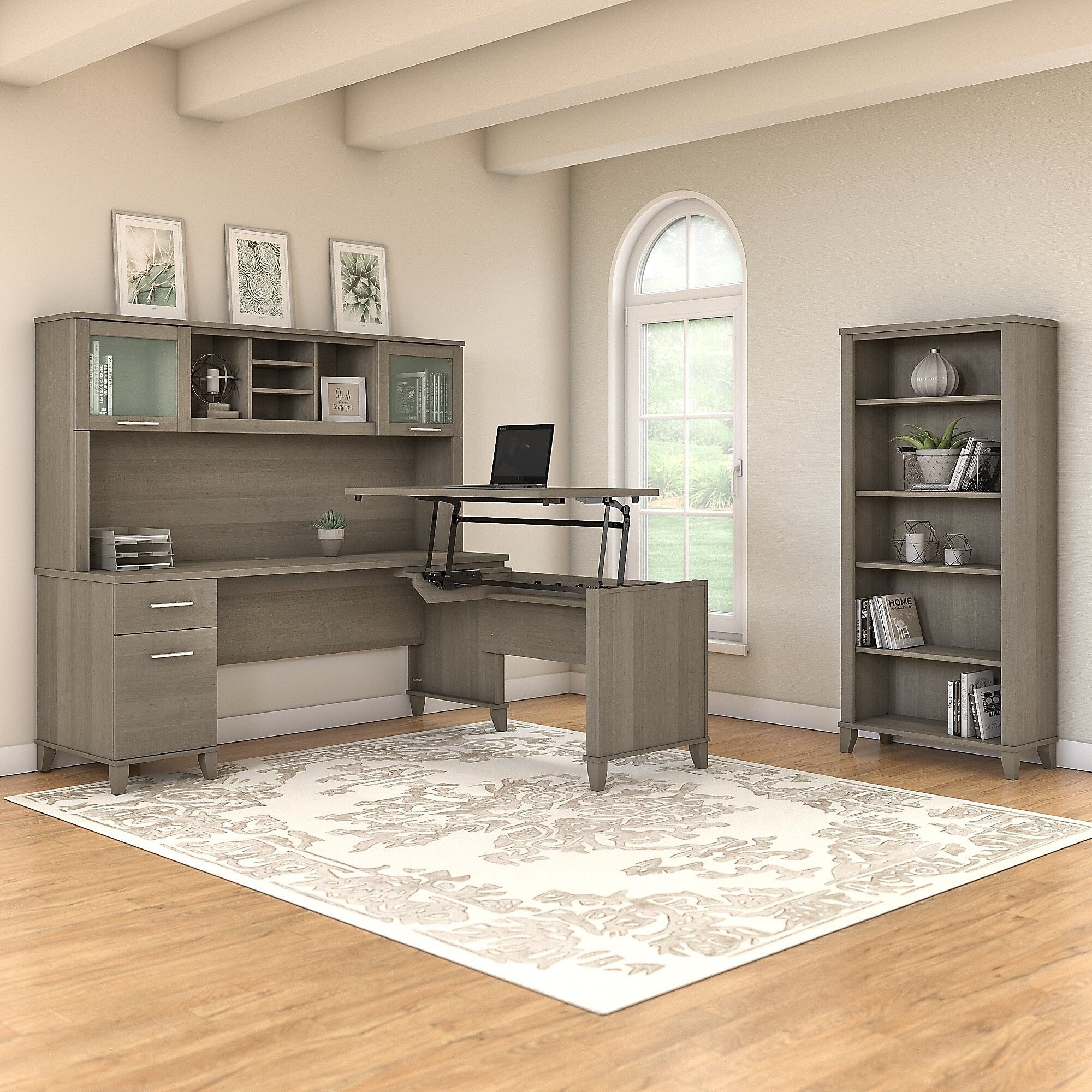 Bush Furniture Somerset 72"W 3 Position Sit to Stand L Shaped Desk with Hutch and Bookcase, Ash Gray (SET017AG)