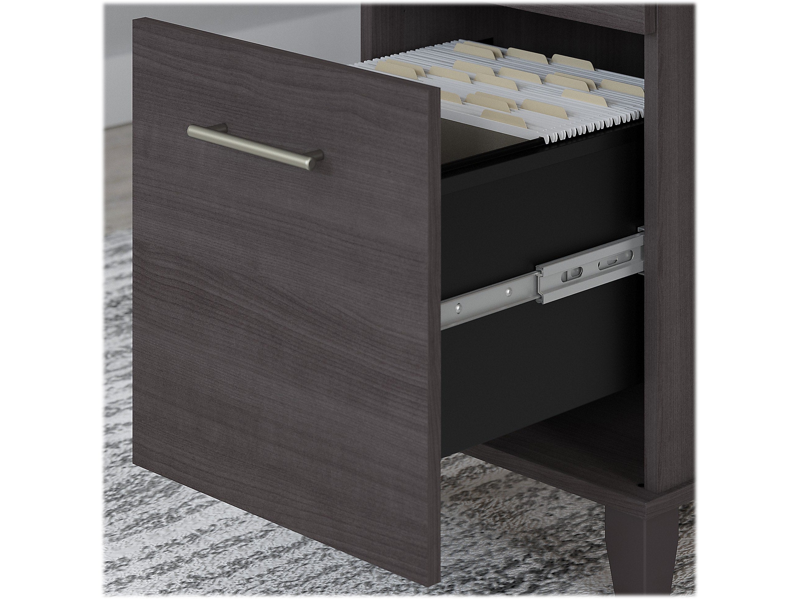 - Filing cabinet's drawers open on full-extension ball bearing slides and hold legal and letter size files