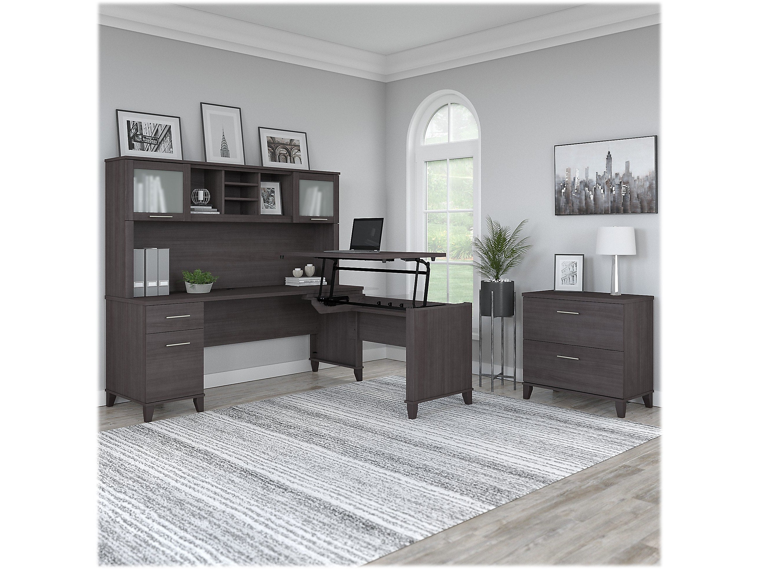 Bush Furniture Somerset 72"W 3 Position Sit to Stand L Shaped Desk with Hutch and File Cabinet, Storm Gray (SET016SG)