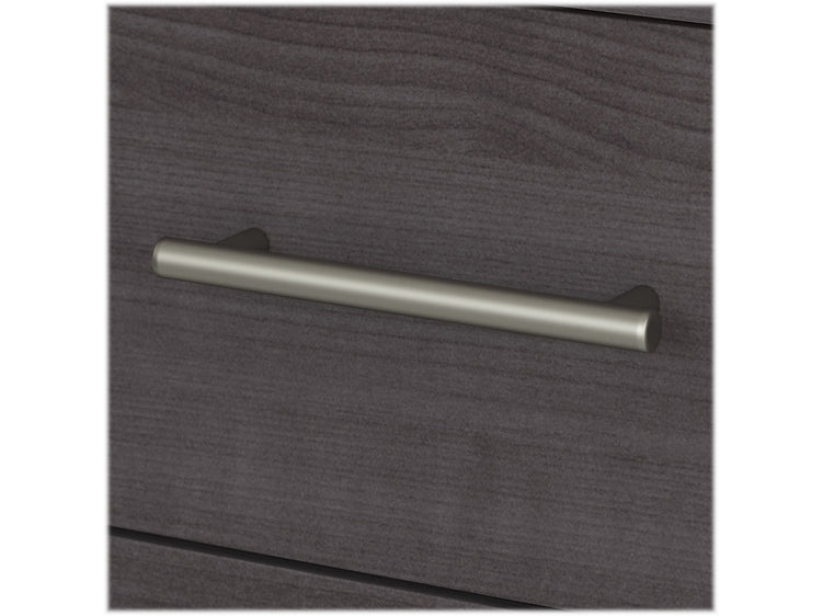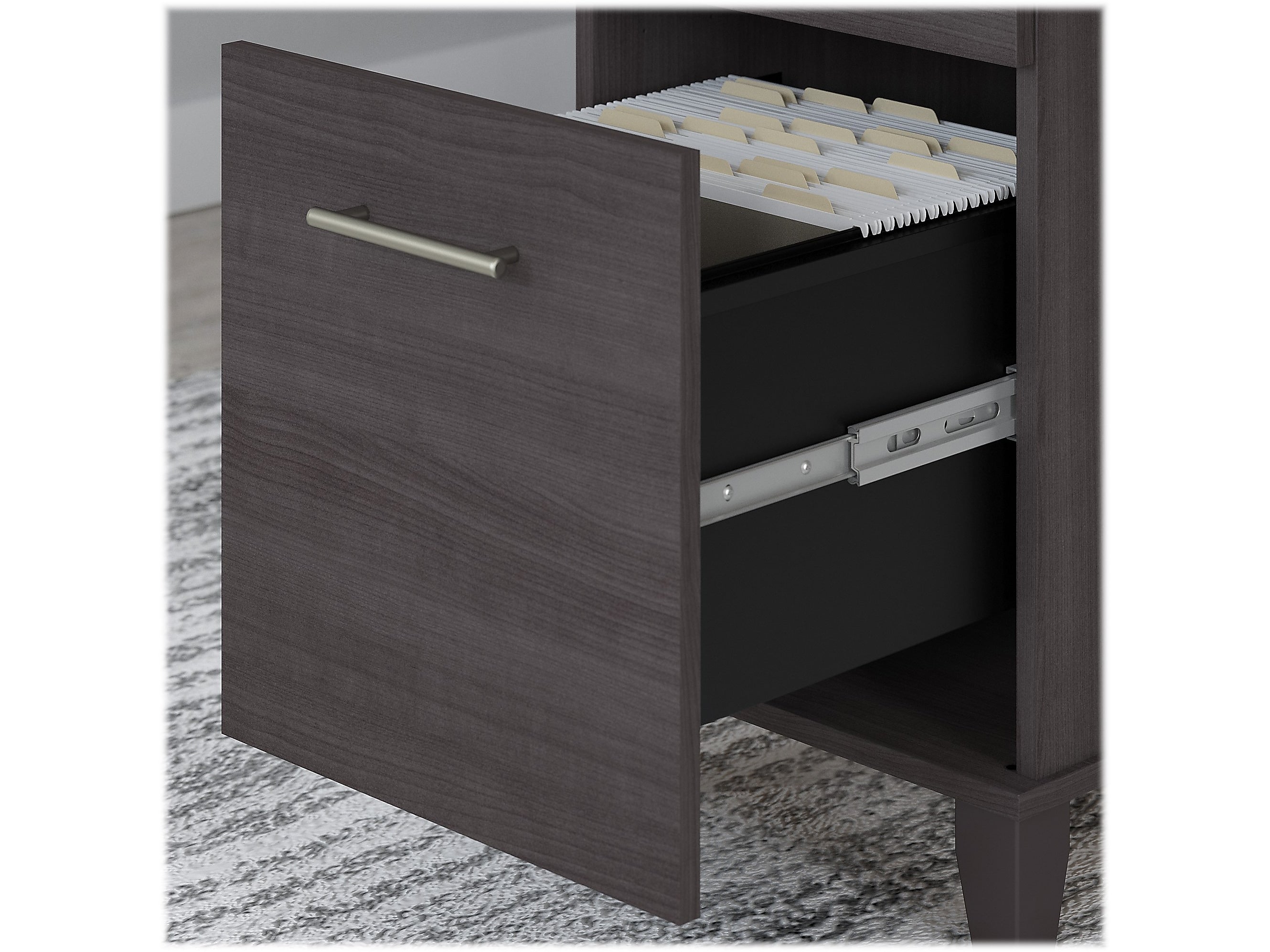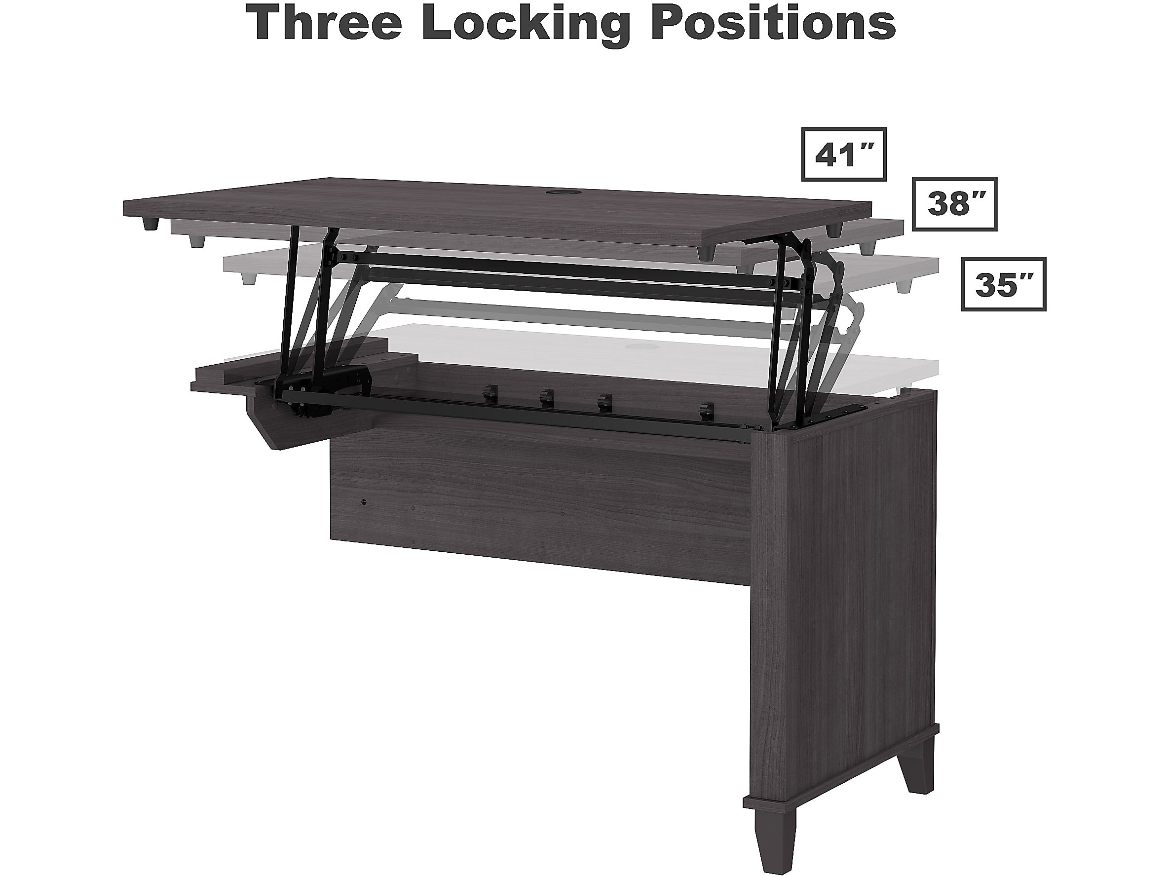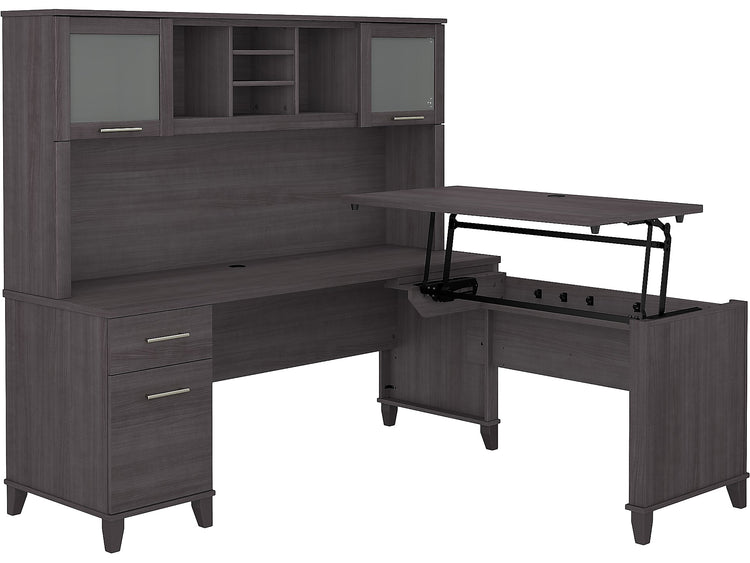 The Bush Furniture Somerset 71"W three-position sit to stand L-shaped desk with hutch offers a perfect solution for those seeking for a stylish and functional ergonomic workspace. The built-in mechanical Lift-n-Lock system allows the desktop to lock into place at standing heights of 35", 38", and 41" and easily return to a seated position. This office desk includes a file drawer that opens on full-extension ball bearing slides for easy access to legal- and letter-size documents and a box drawer for supplies and utensils. The hutch attaches to the desktop and adds two frosted glass doors for concealed storage in addition to open cubby spaces with two shelves. Fixed surfaces are tested to meet ANSI/SOHO standards for safety and performance while the mechanical lift is rigorously tested to Bush Furniture quality standards.