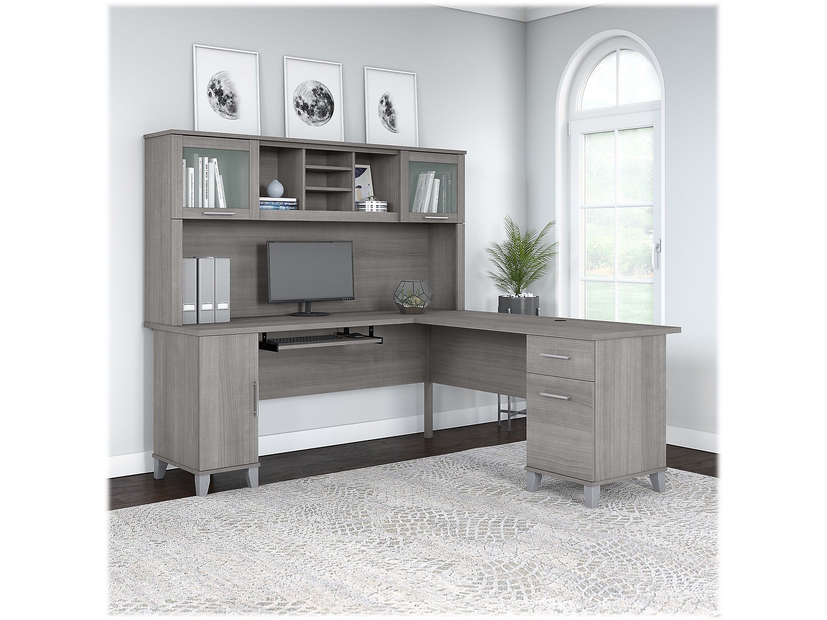 The transitional Bush Furniture Somerset 72"W L-shaped desk with hutch offers a stylish and practical workspace solution for the home or small office. Maximize the potential of your home office with this L-shaped desk with hutch. Create your remote work headquarters with space for a computer, phone, printer, and more. A convenient pull-out tray provides a perfect place to keep a keyboard or laptop, while a storage cabinet and box drawer offer plenty of space for supplies. A file drawer with smooth ball bearing slides allows for easy access to letter-size documents. Wire management grommets help keep cords and cables in order. The hutch features open storage with large compartments for books or decorations, two shelves to hold work in progress, and two frosted glass doors that provide concealed storage. This home office furniture set is tested to meet ANSI/SOHO standards for safety and performance and is backed by the Bush Furniture 6-year manufacturer warranty. American-made with US and imported parts.