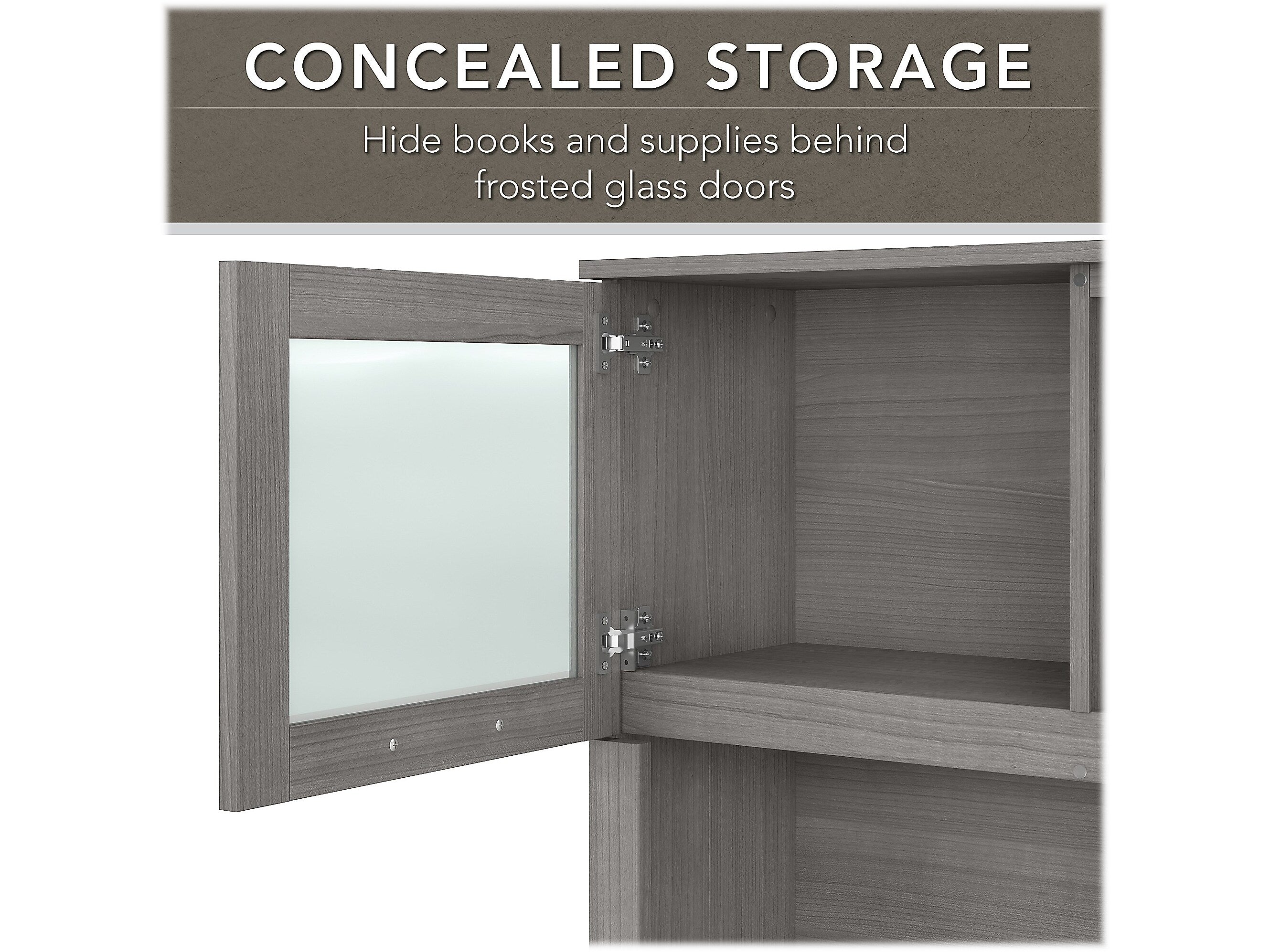 - Hutch has open compartments with two shelves and closed storage areas with glass doors