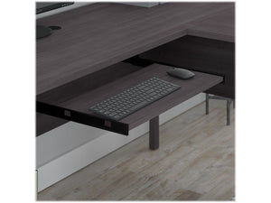 - Corner desk includes a pull-out keyboard/laptop tray that can mount to either side for a custom configuration