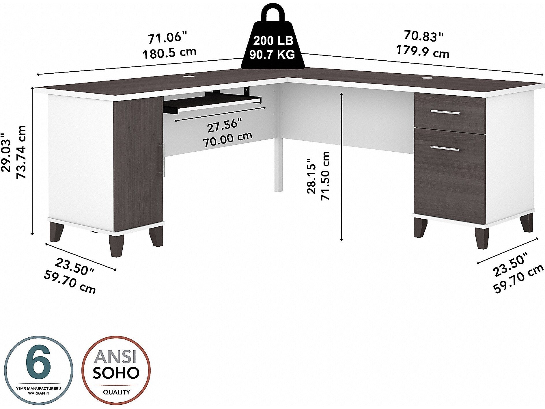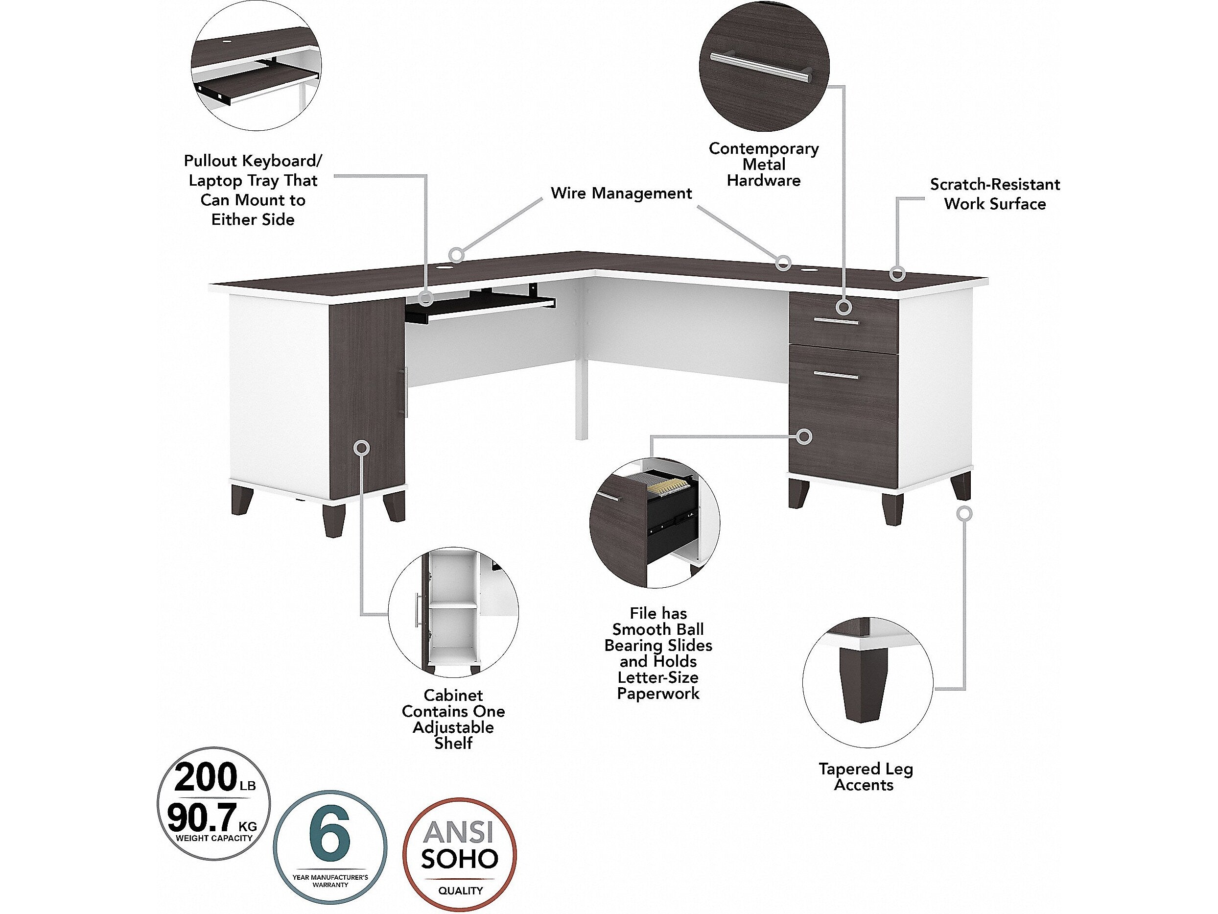Maximize the potential of your home office with the Bush Furniture Somerset 72"W L-shaped desk with storage. Create your remote work headquarters with space for a computer, phone, printer, and more on a surface that features wire management slots for keeping cords and cables in order. A convenient pull-out shelf provides a perfect place to keep a keyboard or laptop, and the desk also includes a vertical storage cabinet with an adjustable shelf. Place pens, paper, and more in the box drawer, and enjoy a file drawer gliding on smooth ball bearing slides for an easy reach to documents. Transitional styling includes a stylish finish with tapered legs and contemporary metal hardware for an alluring appearance. This desk with storage meets or exceeds ANSI/SOHO standards for safety and performance and is backed by a 6-year manufacturer limited warranty. American-made with US and imported parts.