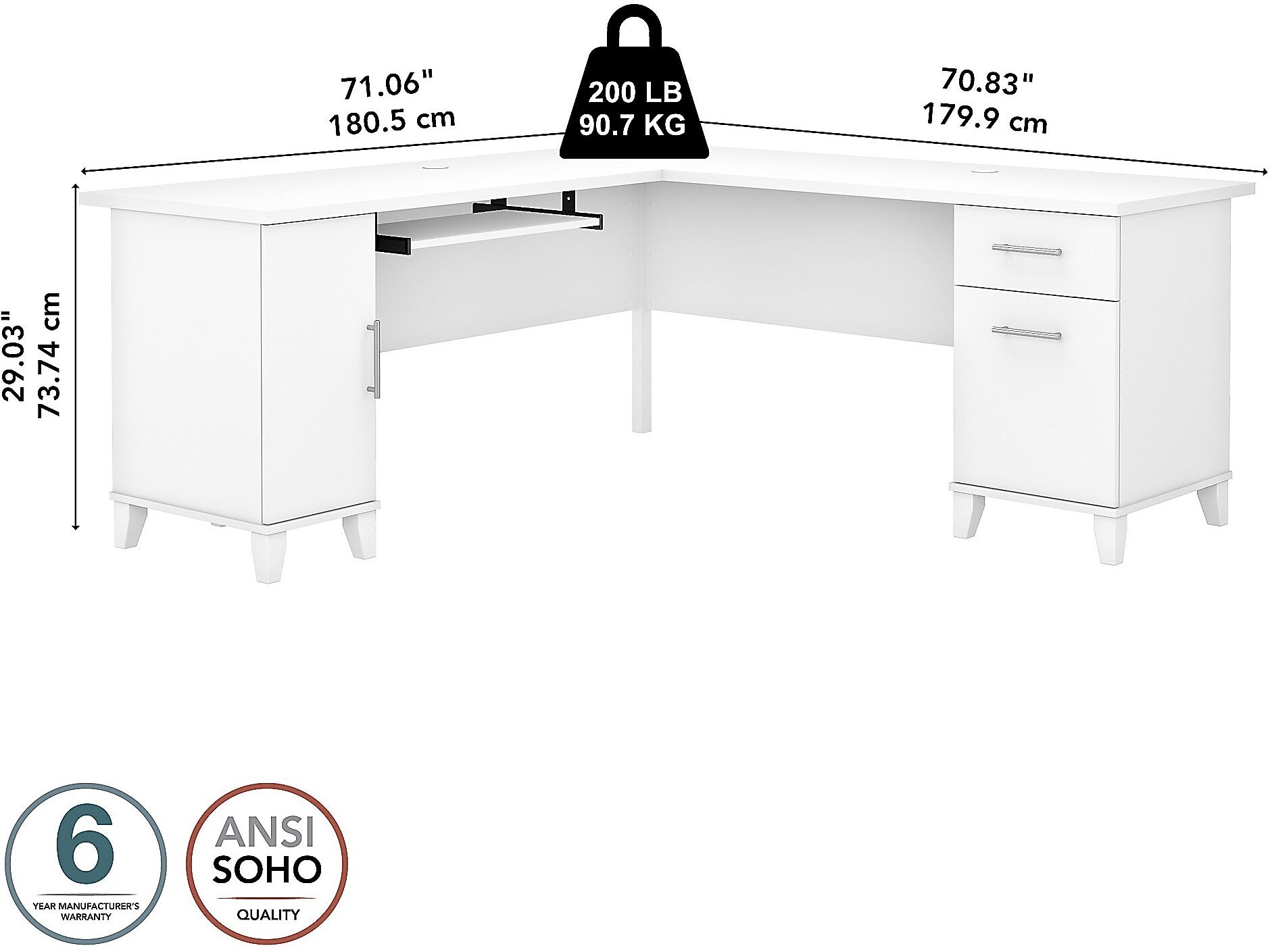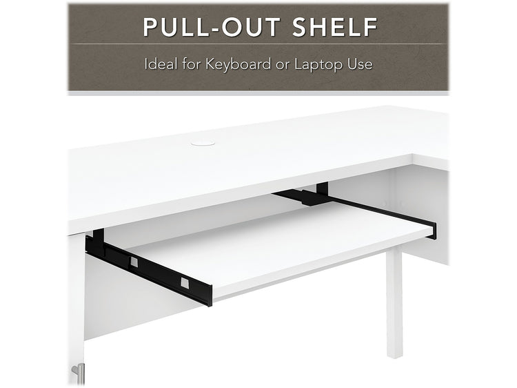 Build your home office around the Bush Furniture Somerset 72"W L-shaped desk with storage, featuring transitional style and plenty of space for materials. Maximize the potential of your home office with this desk. Create your remote work headquarters with space for a computer, phone, printer, and more on a surface that features wire management grommets for keeping cords and cables in order. A convenient pull-out tray provides a perfect place to keep a keyboard or laptop, and the desk also includes a vertical storage cabinet with an adjustable shelf. Place pens, paper, and more in the box drawer, and enjoy a file drawer gliding on smooth ball bearing slides for an easy reach to documents. Transitional styling offers an elegant finish with tapered legs and contemporary metal hardware for an alluring appearance. This desk with storage is tested to meet ANSI/SOHO standards for safety and performance and is backed by the Bush Furniture 6-year manufacturer warranty. American-made with US and imported parts.