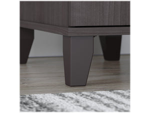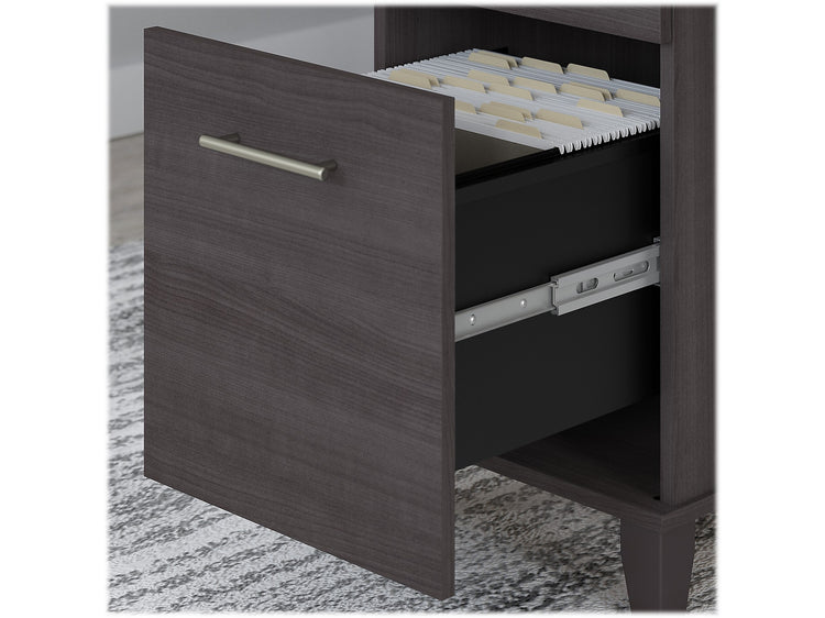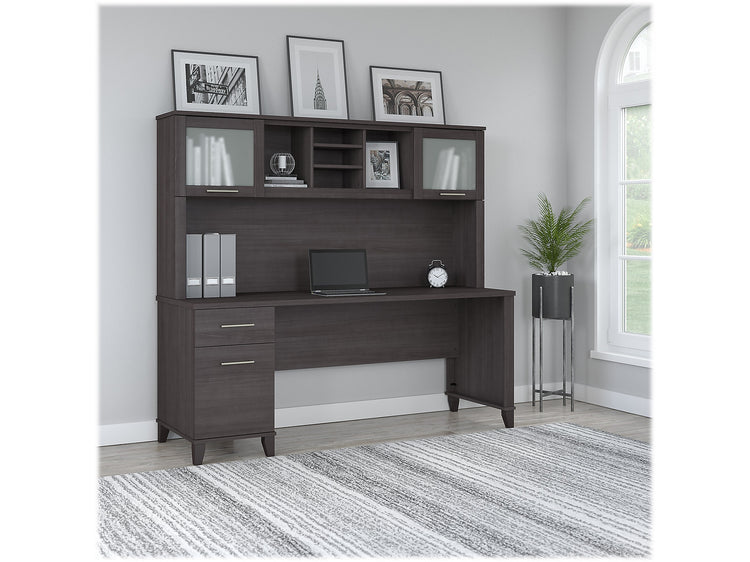 The transitional Bush Furniture Somerset 71" office desk with hutch offers a stylish and practical workspace solution for the home or small office. A spacious work surface and plenty of storage capacity make this desk with drawers and hutch a perfect choice for your home office. Spread out with a computer and paperwork while multitasking on an expansive desktop that includes a wire management grommet to keep cords and cables in order. The desk's file drawer opens on smooth full-extension ball bearing slides for easy access to legal- and letter-size documents, while a box drawer keeps the office supplies and utensils you need close by. The hutch attaches to the desktop and adds a pair of frosted glass doors for concealed storage in addition to open cubby spaces with two shelves for books, decorations, and more. This home office desk with drawers and hutch set is tested to meet ANSI/SOHO quality standards for safety and performance and is backed by the Bush Furniture 6-year manufacturer warranty.