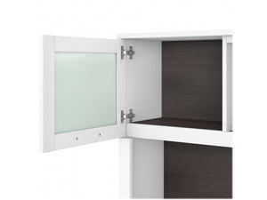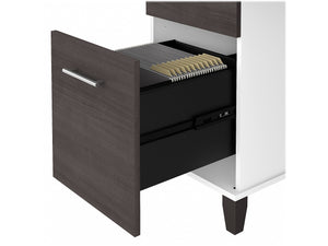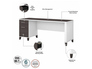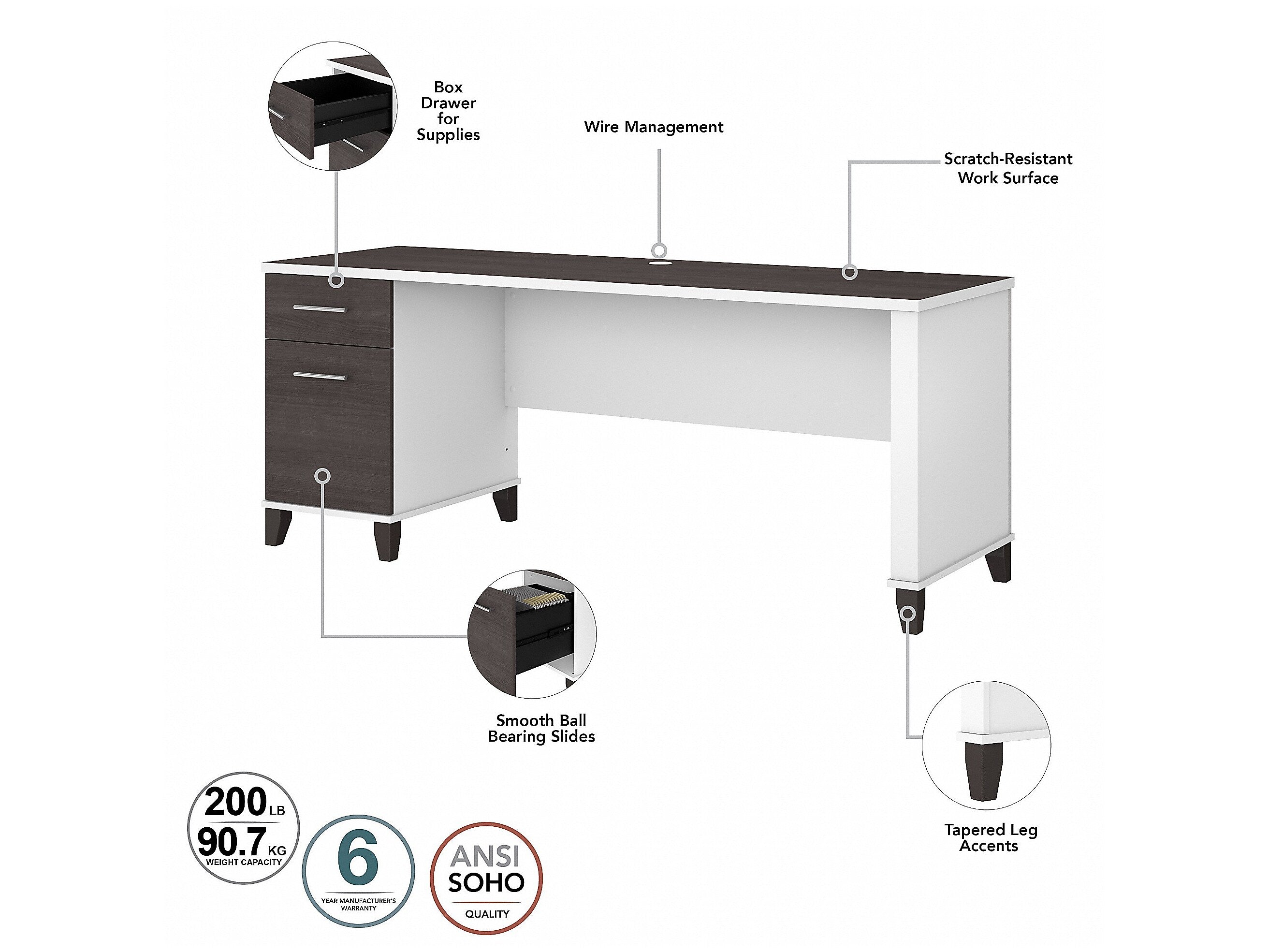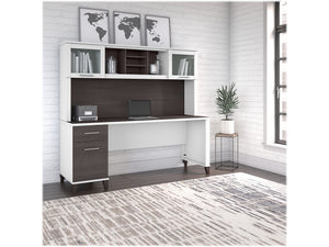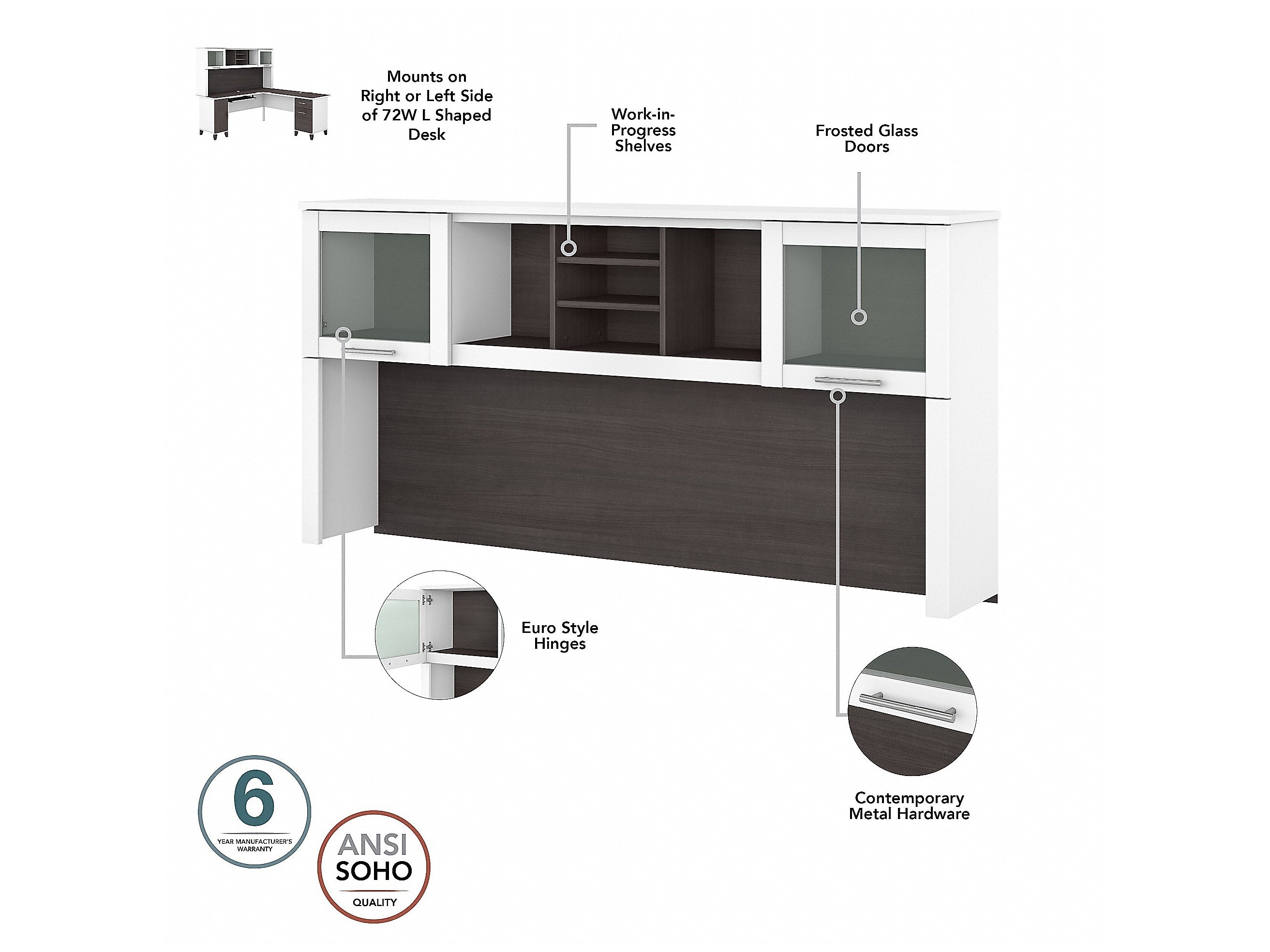 A spacious work surface and plenty of storage capacity make the Bush Furniture Somerset 72"W office desk with drawers and hutch a perfect choice for your home office. Spread out with a computer and paperwork while multitasking on an expansive desktop that includes wire management to keep cords and cables in order. The desk's file drawer opens on smooth full-extension ball bearing slides for easy access to legal- and letter-size documents, while a box drawer keeps the office supplies and utensils you need close by. The hutch attaches to the desktop and adds a pair of frosted glass doors for concealed storage, in addition to open cubby spaces with two shelves for books, decorations, and more. This home office desk with drawers and hutch set is tested to meet ANSI/SOHO quality standards for safety and performance and is backed by the Bush Furniture 6-year manufacturer limited warranty.