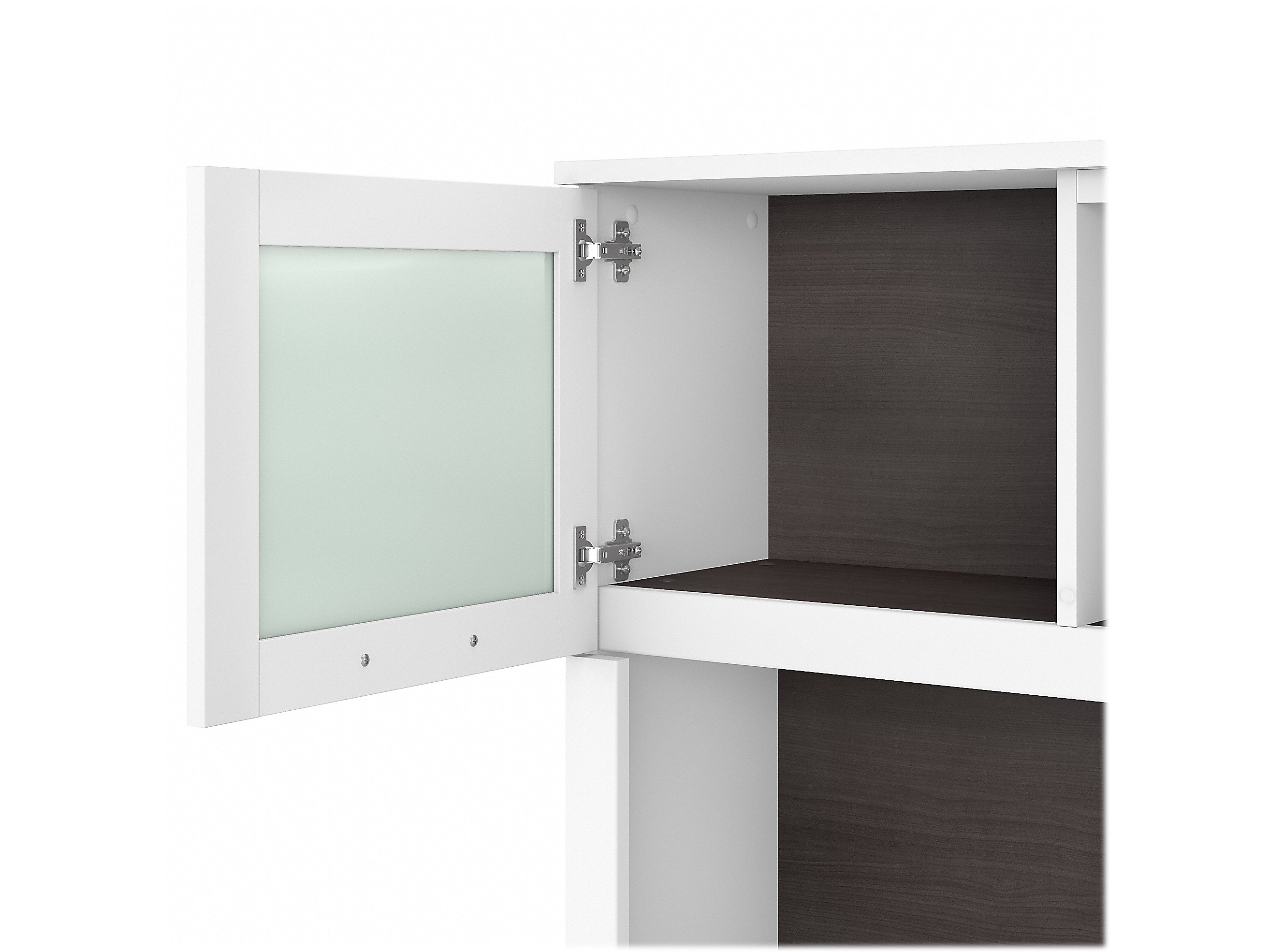 - Hutch attaches to the desktop and features two frosted glass doors for concealed storage