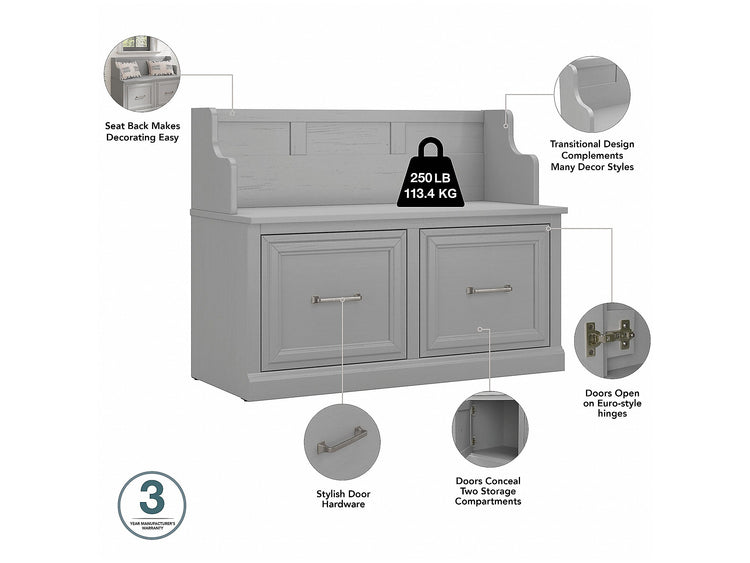 The Bush Furniture Woodland 40W Entryway Bench with Doors combines transitional styling and a practical design to offer an ideal shoe storage solution. Have a seat on the durable shoe bench surface and take a moment to relax as you get ready to head out the door or come home after a long day. The top of the mudroom bench supports up to 250 pounds, so you can sit down to put on and take off your shoes or set shopping bags down after a trip to the store with confidence. Cabinet doors conceal two internal compartments that keep footwear in order and out of sight. The entryway organizer's transitional design blends elements of contemporary and traditional styling to complement a wide range of home furnishings. This storage bench with back has been rigorously tested to meet Bush Furniture's standards for safety, performance and durability and is backed by a 3 Year Manufacturer's Warranty.