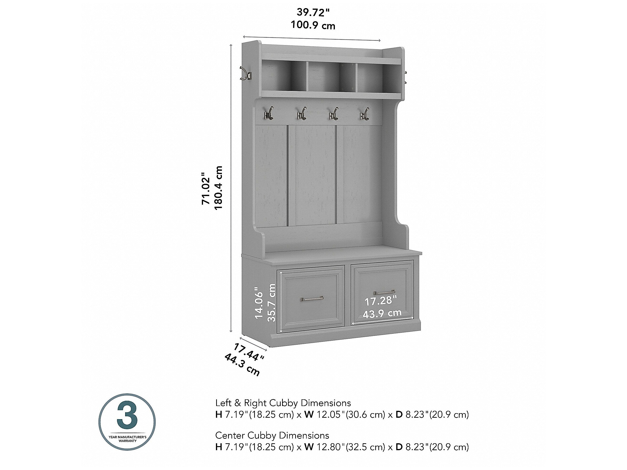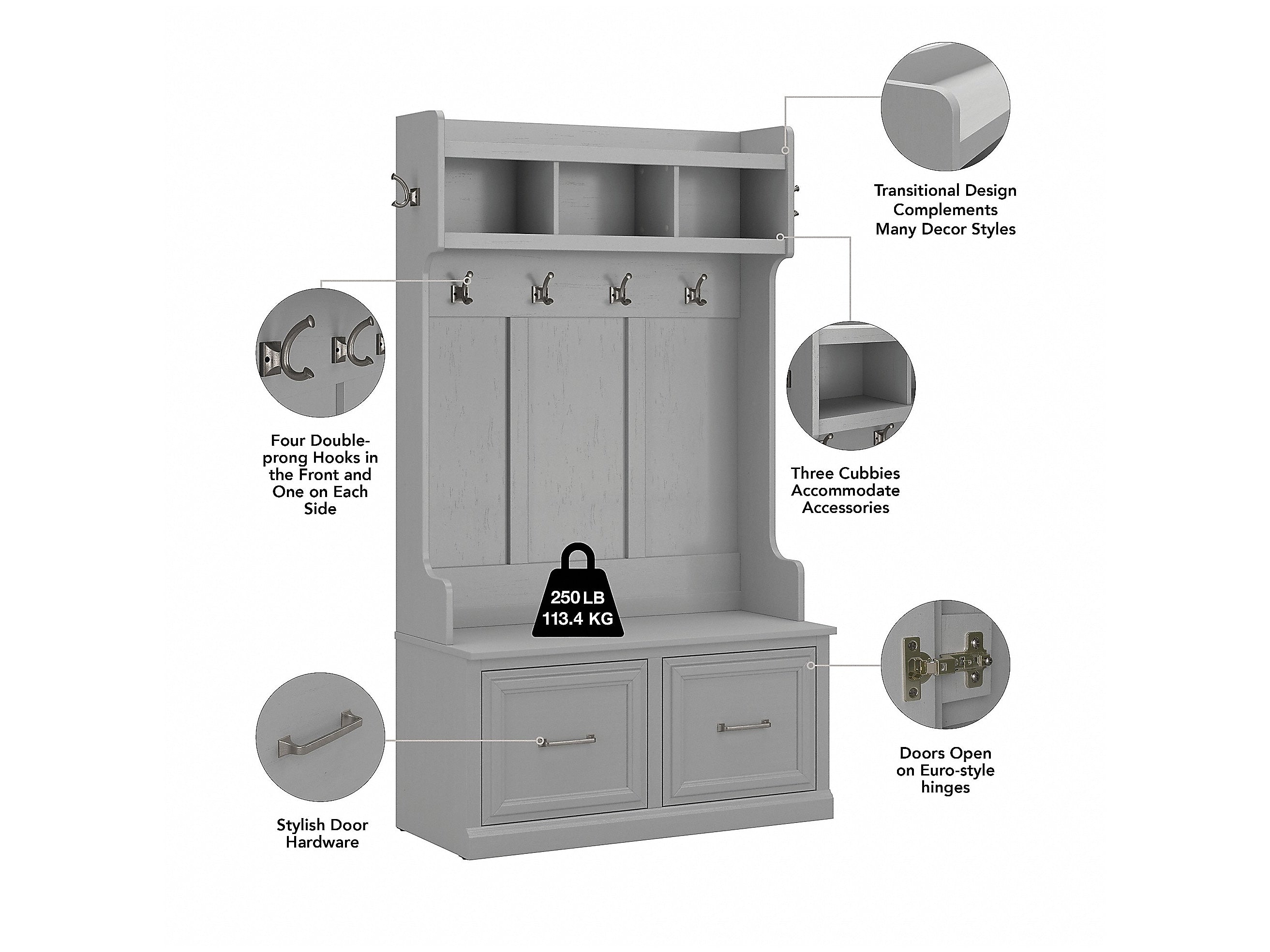 The Bush Furniture Woodland 40W Hall Tree and Shoe Storage Bench with Doors combines transitional styling and a practical design to offer an ideal entryway organizer. Have a seat on the durable bench and take a moment to relax as you get ready to head out the door or come home after a long day. The top of the mudroom bench supports 250 pounds, so you can sit down to put on and take off your shoes or set bags down with confidence. Cabinet doors conceal two internal compartments that keep footwear in order and out of sight. The Hall Tree includes four coat hooks in the front and one on each side for hanging jackets, hats, scarves and more. Smaller items like gloves and keys can be stashed inside three open cubby spaces. This entryway bench with storage has been rigorously tested to meet Bush Furniture's standards for safety, performance and durability and is backed by a 3 Year Warranty.