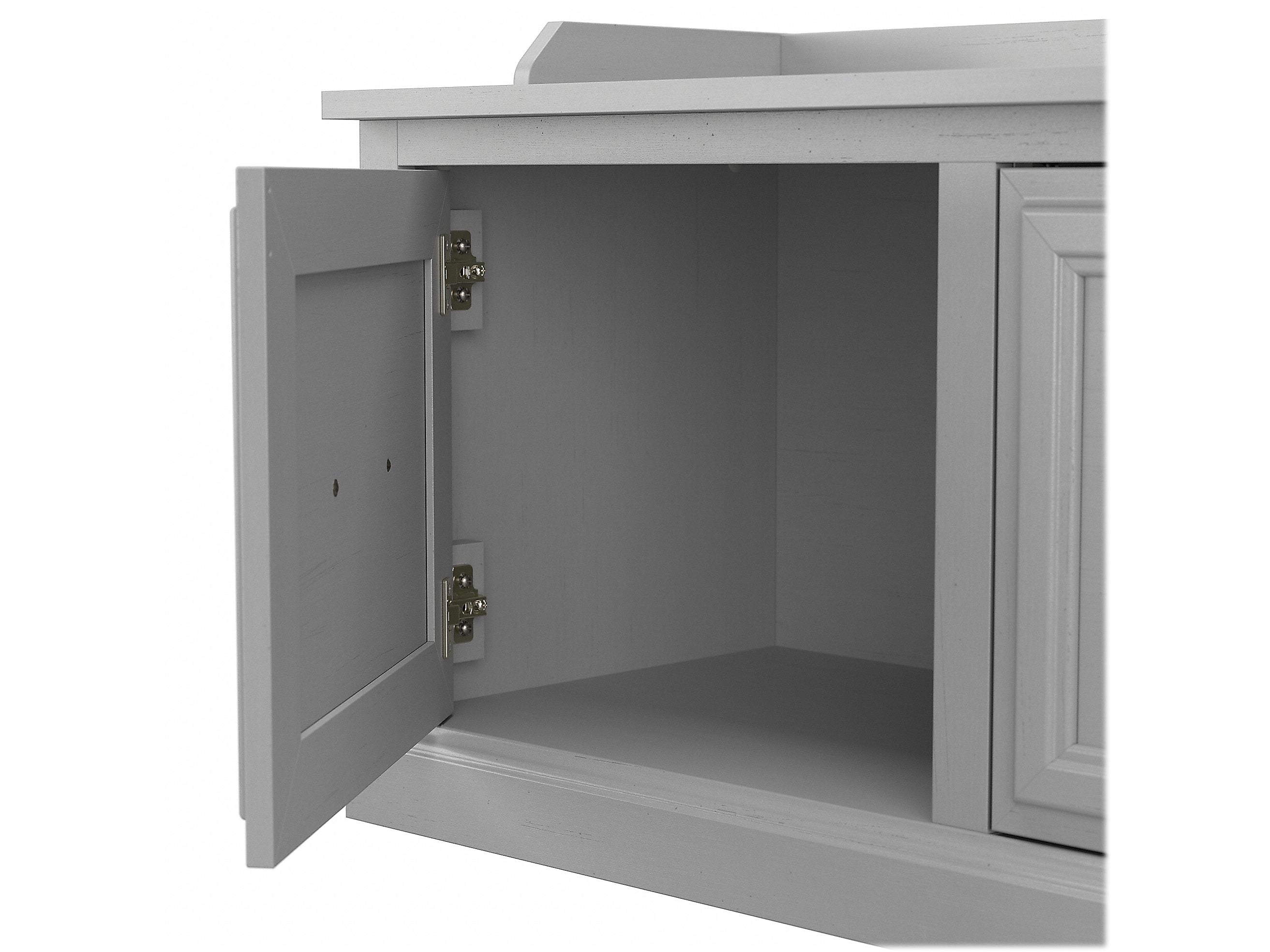 - Cabinet doors with Euro-style hinges open to reveal two compartments for storing footwear and other accessories