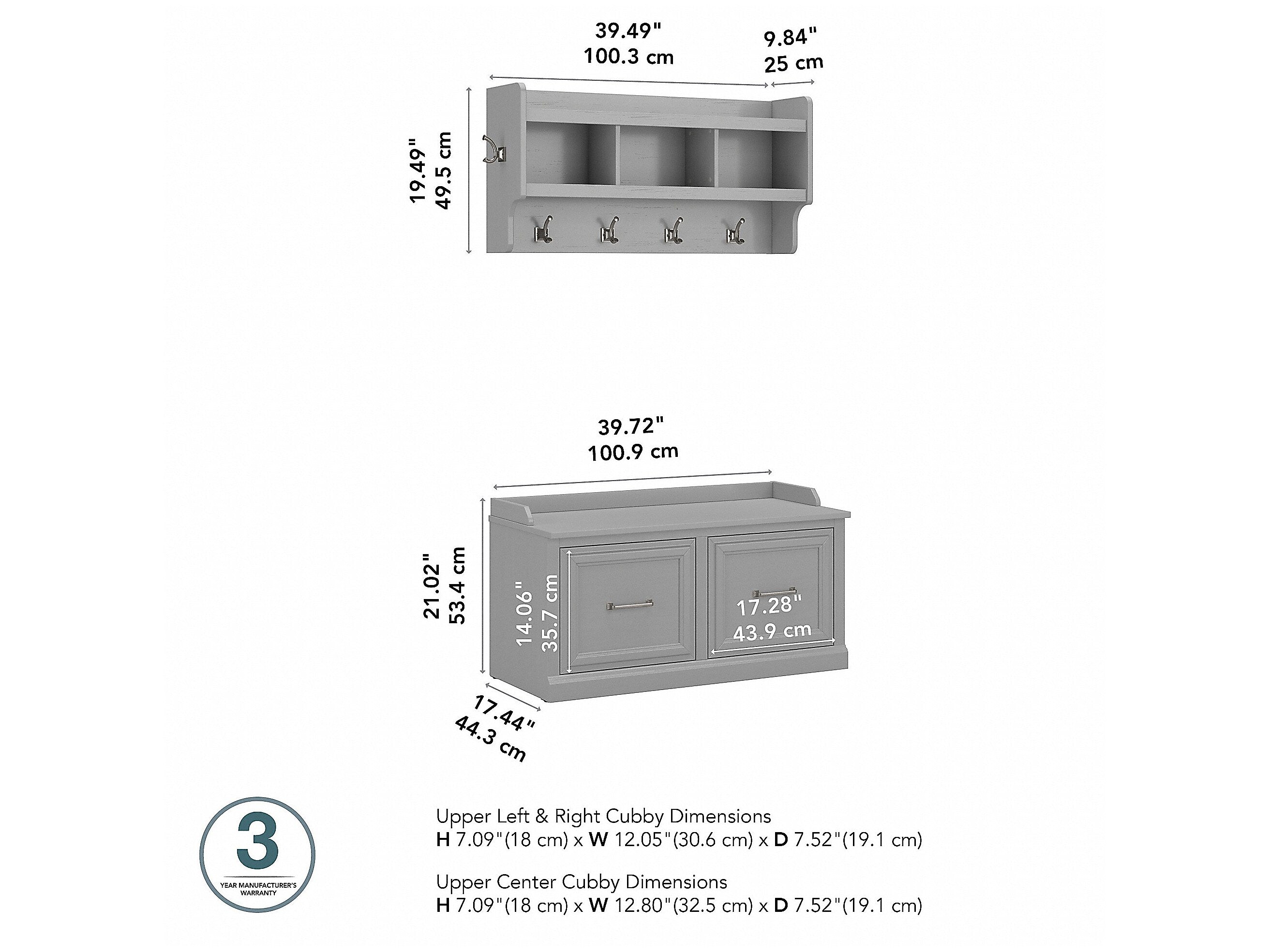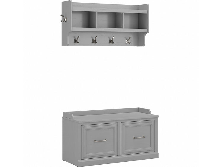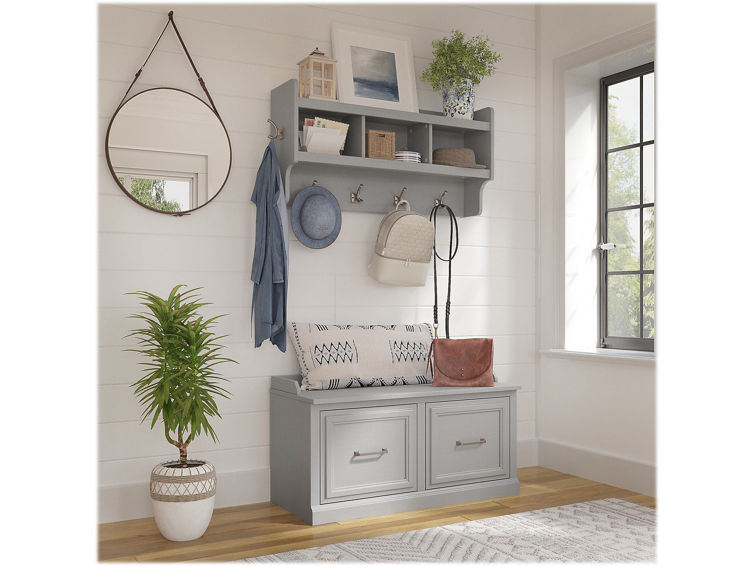 The Bush Furniture Woodland 40W Shoe Storage Bench with Doors and Wall Mounted Coat Rack combines transitional styling and a practical design to offer an ideal entryway organizer. Have a seat on the durable bench and take a moment to relax as you get ready to head out the door or come home after a long day. The top of the mudroom bench supports 250 pounds, so you can sit down to put on and take off your shoes or set shopping bags down with confidence. Cabinet doors conceal two internal compartments that keep footwear in order and out of sight. The wall shelf includes six coat hooks for hanging jackets, hats, scarves and more. Smaller items like gloves and keys can be stashed neatly inside three open cubby spaces. This entryway bench and coat rack has been rigorously tested to meet Bush Furniture's standards for safety, performance and durability and is backed by a 3 Year Warranty.