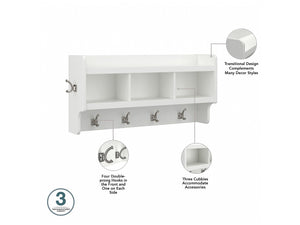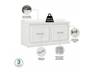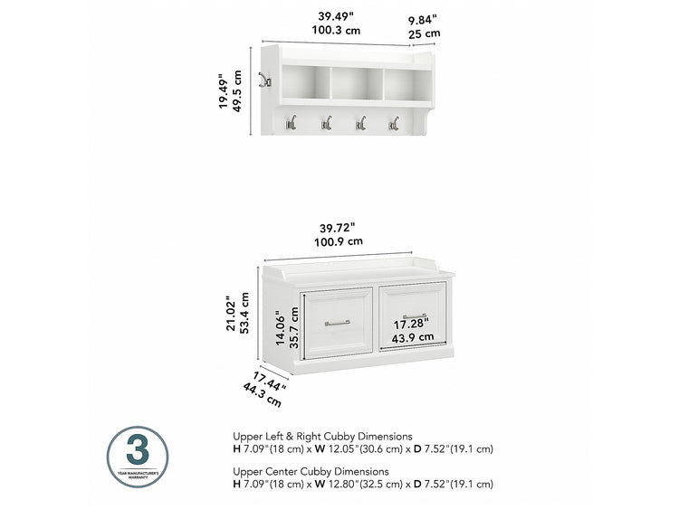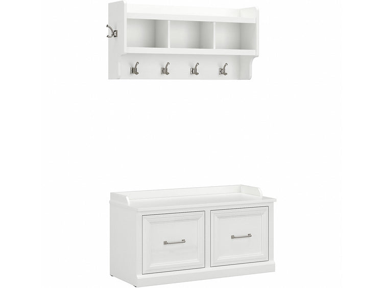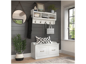 The Bush Furniture Woodland 40W Shoe Storage Bench with Doors and Wall Mounted Coat Rack combines transitional styling and a practical design to offer an ideal entryway organizer. Have a seat on the durable bench and take a moment to relax as you get ready to head out the door or come home after a long day. The top of the mudroom bench supports 250 pounds, so you can sit down to put on and take off your shoes or set shopping bags down with confidence. Cabinet doors conceal two internal compartments that keep footwear in order and out of sight. The wall shelf includes six coat hooks for hanging jackets, hats, scarves and more. Smaller items like gloves and keys can be stashed neatly inside three open cubby spaces. This entryway bench and coat rack has been rigorously tested to meet Bush Furniture's standards for safety, performance and durability and is backed by a 3 Year Warranty.